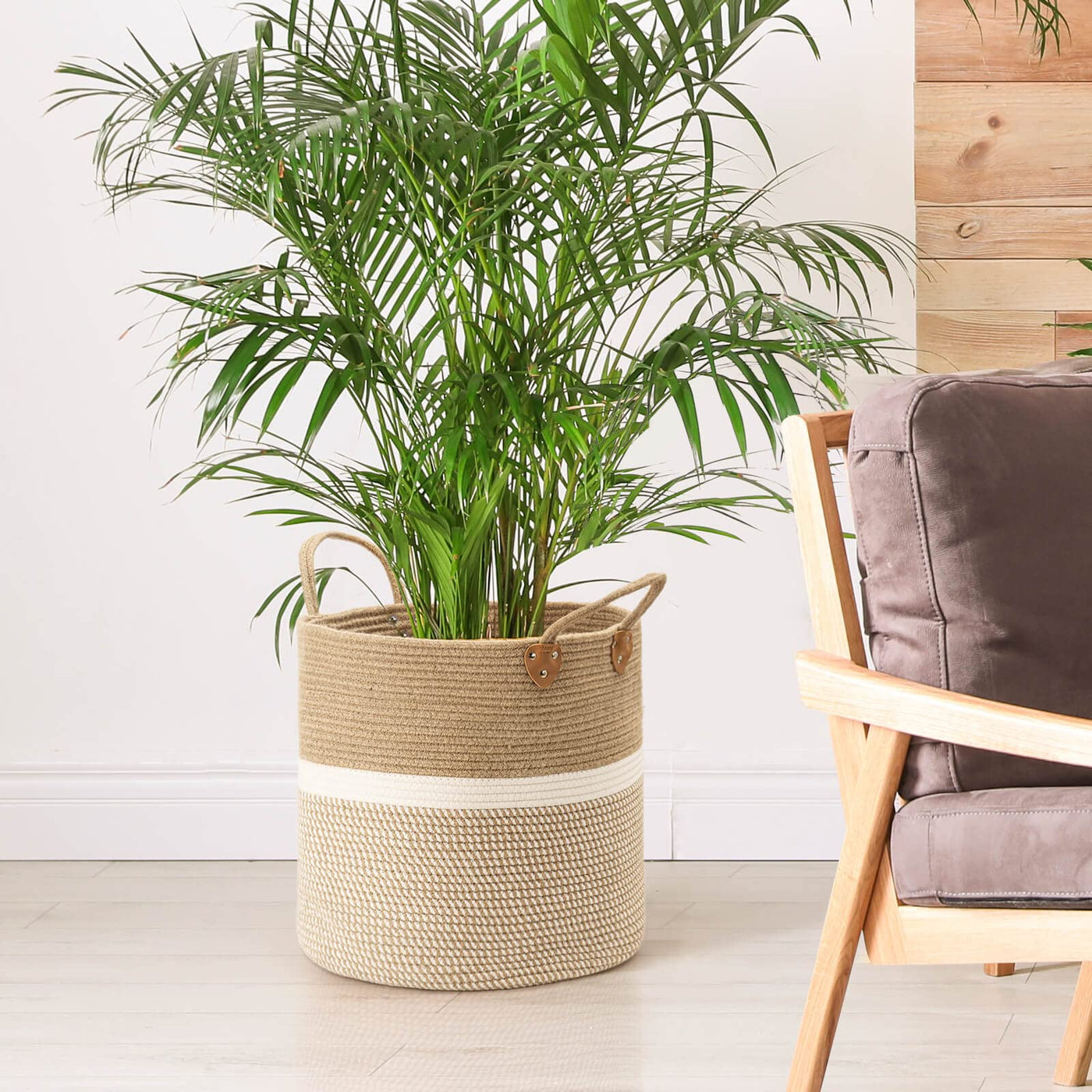 • Q: What materials are used in the construction of the jute basket? A: The basket is made from a combination of jute and cotton rope, ensuring durability while remaining soft enough to avoid scratching clothing and surfaces.