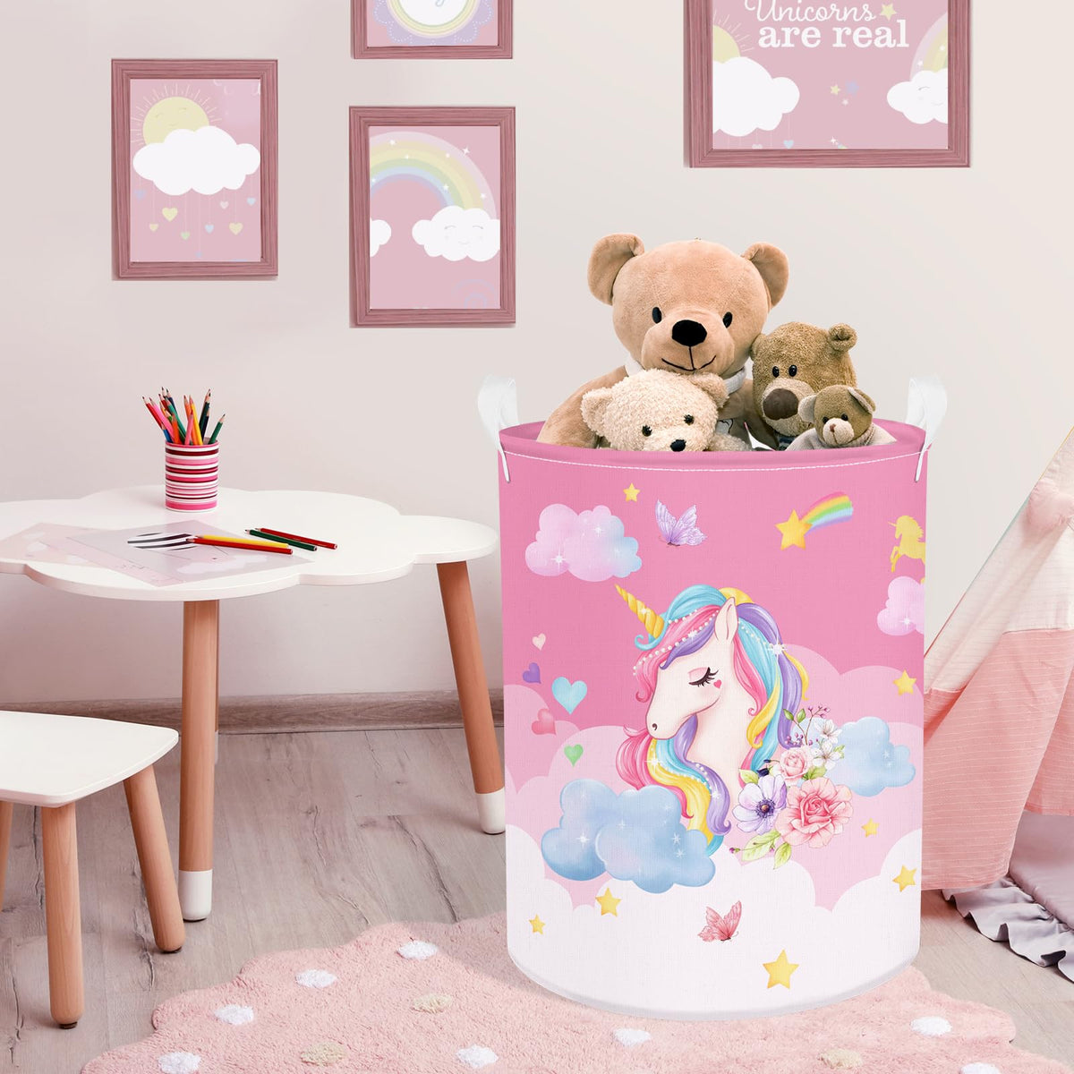 - Q: Is the Clastyle laundry basket suitable for children? A: Yes, the Clastyle laundry basket features a fun and colorful design with unicorns, rainbows, and stars, making it an appealing storage solution for children's rooms.