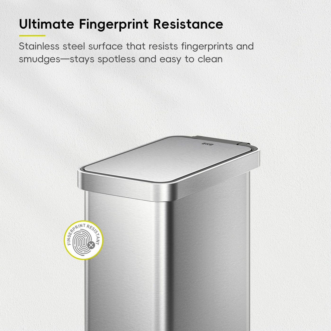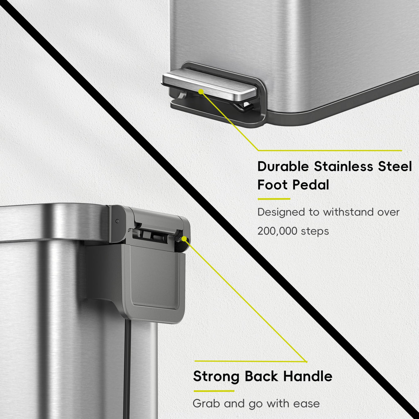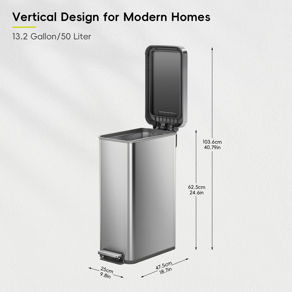 Durable Pedal Design - The stainless steel foot pedal offers smooth, hands-free operation and is engineered to withstand over 200,000 steps - built for lasting performance in busy households | Slim & Space-Saving - Slim and narrow, this 50L vertical trash can fits easily into tight spots-between cabinets, beside appliances, or along walls. A clean, efficient solution where floor space is limited | 25% More Capacity - The liner-free design removes the bulky inner bucket to free up space, giving you up to 25% more room for waste-perfect for busy kitchens and households with frequent trash use | Soft Close & Stay-Open - The soft-close lid shuts quietly and gently every time-no loud slams or sudden drops. It also stays open when needed, making it ideal for multitasking during meal prep or cleanup | Ultimate Fingerprint Resistance - The fingerprint-proof and smudge-resistant finish keeps the 13.2-gallon stainless steel surface looking sleek and spotless. Even with frequent use, it stays clean and polished with minimal effort