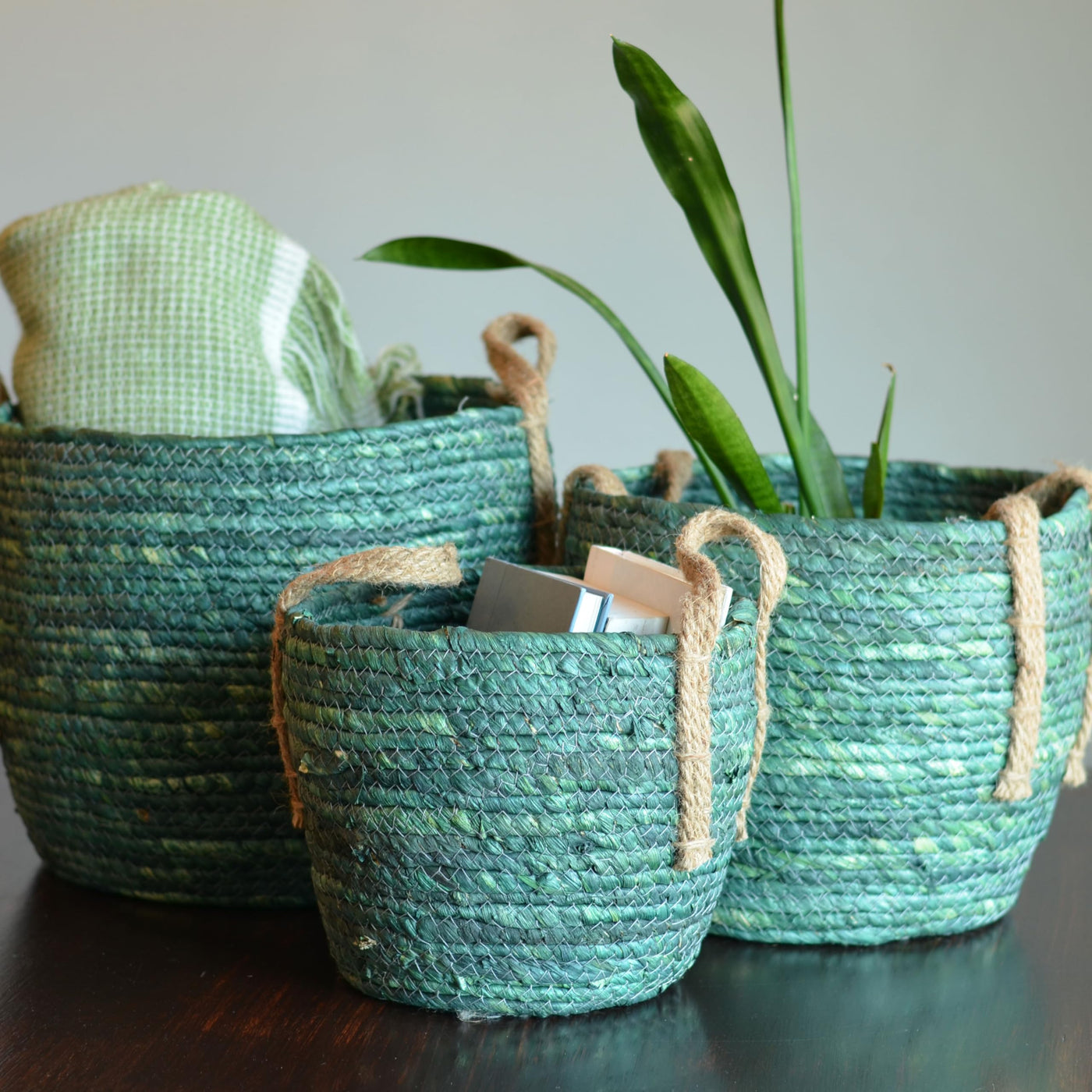 Farmers 3 Piece Basket Set, Green Dye Soaked Floor And Shelf Organizers, Corn Husk Wicker, Durable Chunky Rope Weave, Handles, S