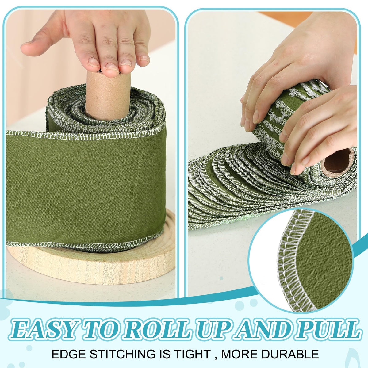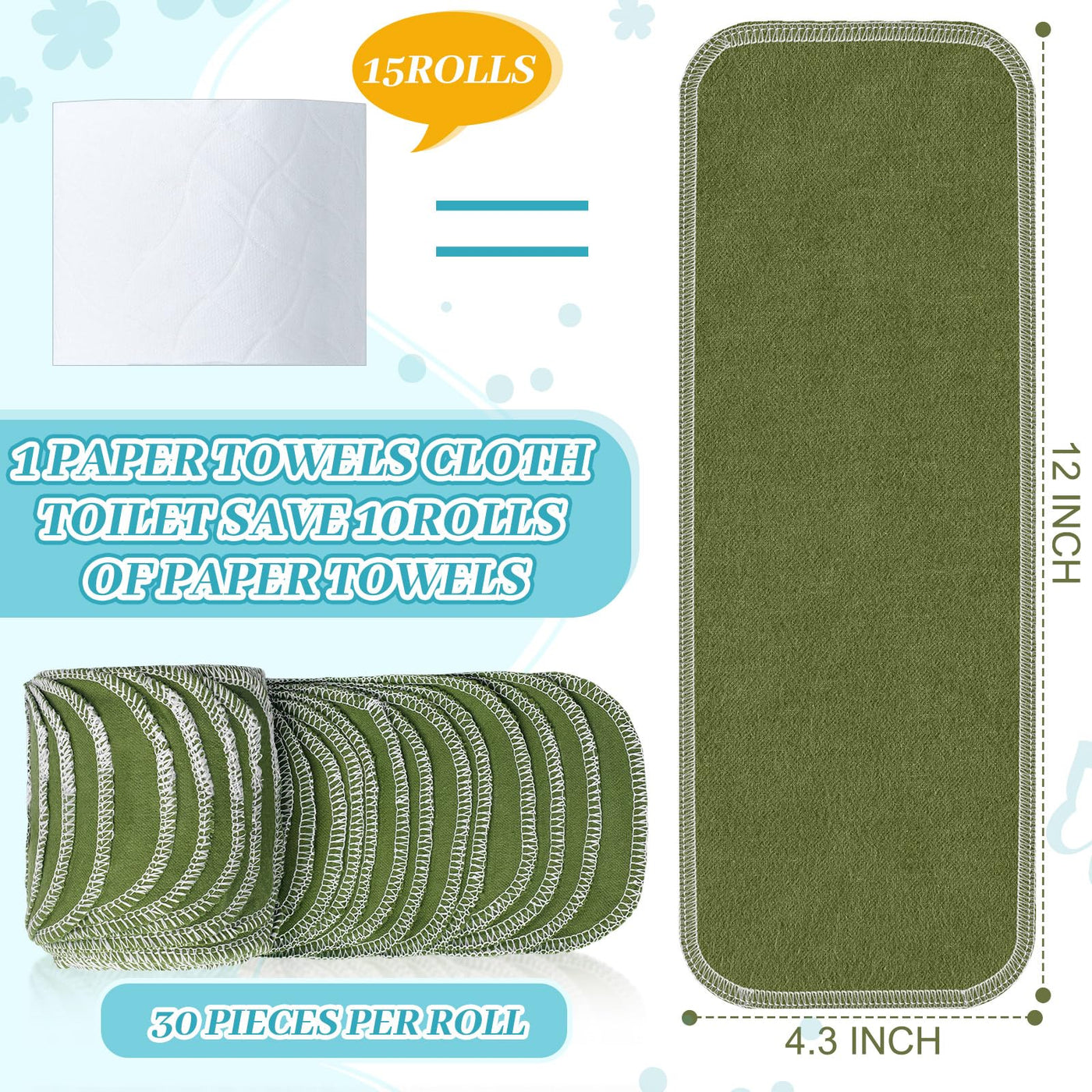 Features: Reusable paper towels washable roll for reducing waste. Using tips: you can wet one end, wipe with the wetted end, then using the dry end to wipe again. Storing tips: re roll bidet towels or half fold to stack. Washing tips: Machine washable and hand washable. To having a longer service life, please put in a laundry bag before machine washing. Then air dry in a ventilated place. Specifications: Material: cotton Color: greenSize: 4.3 x 12 inches/ 11 x 30 cmPackage includes: 30 x Reusable toilet paperNotes: Manual measurement, please allow slight errors on size. The color may exist a slight difference due to different screen displays.
