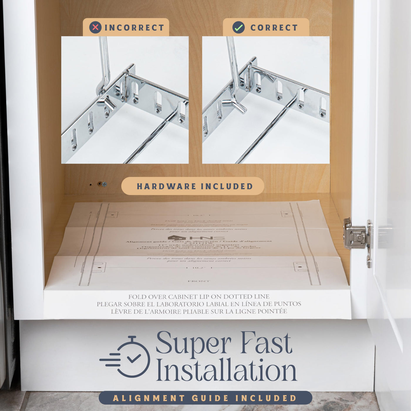 • Q: What are the installation requirements for this product? A: The installation requires a cabinet opening of at least 14-1/4 inches wide. It comes with all necessary hardware and step-by-step instructions for easy setup.
