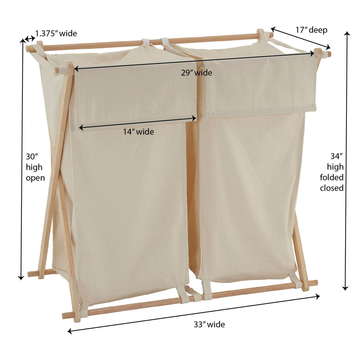 - Q: What are the dimensions of the Household Essentials Collapsible Double X-Frame Laundry Hamper Sorter? A: The dimensions of the laundry hamper sorter are 30 inches tall, 30 inches wide, and 17 inches deep.
