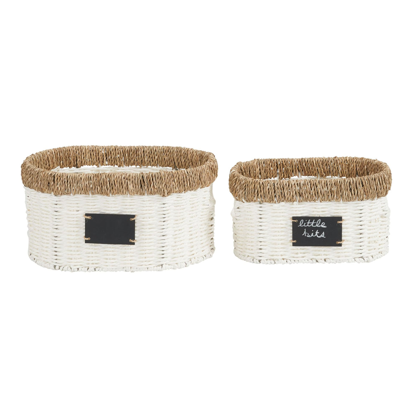 Household Essentials Natural Rim Oval Set Paper Rope And Seagrass (2 Piece) Small Wicker Basket, White