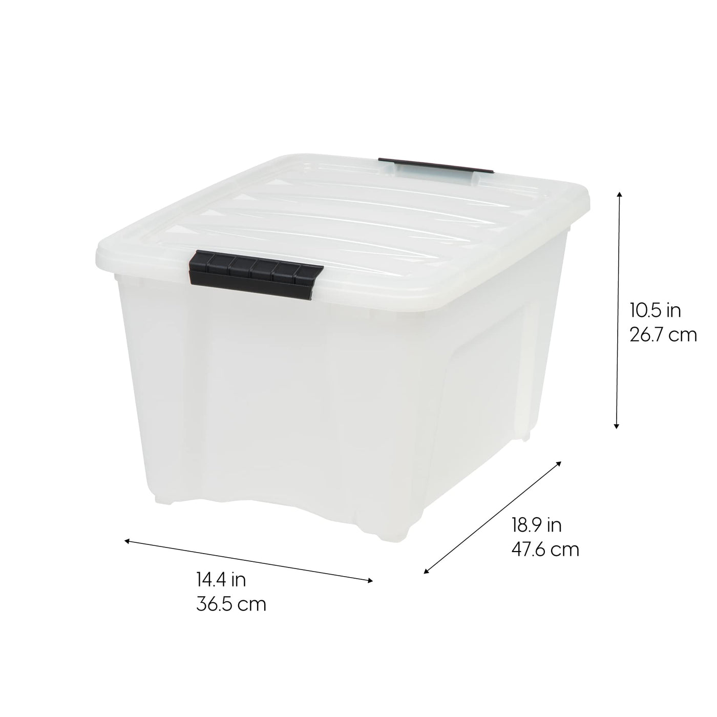 - Q: What are the dimensions of the IRIS USA 32 Quart Stackable Plastic Storage Bins? A: The dimensions of each storage bin are 18.75 inches long, 14.38 inches wide, and 10.50 inches high.