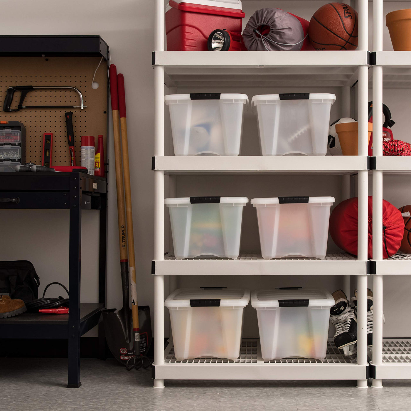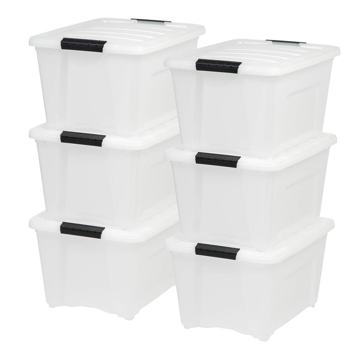 IRIS USA 32 Qt. Plastic Storage Container Bin with Secure Lid and Latching Buckles 6 pack - Pearl Durable Stackable Nestable Organizing Tote Tub Box Toy General Organization Medium