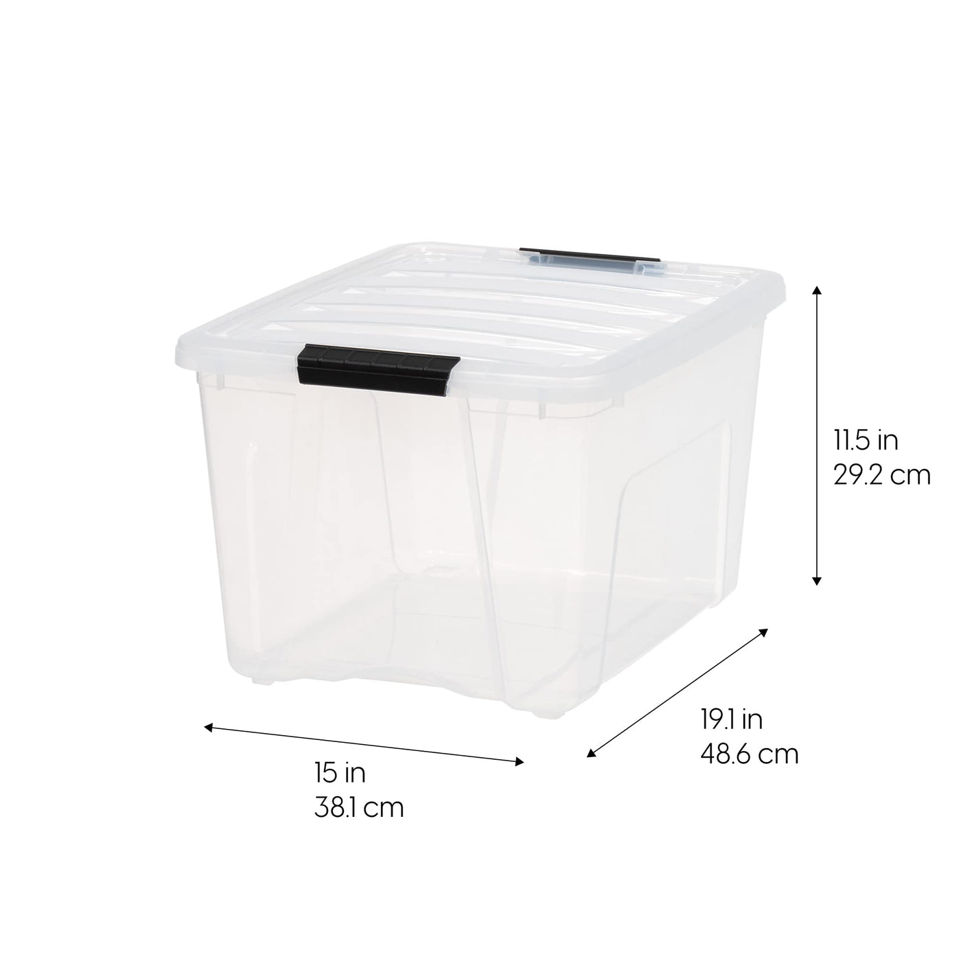 • Q: What are the dimensions of the IRIS USA 40qt plastic storage bin? A: The dimensions of the IRIS USA 40 quart plastic storage bin are 19.13 inches long, 15 inches wide, and 11.5 inches high.