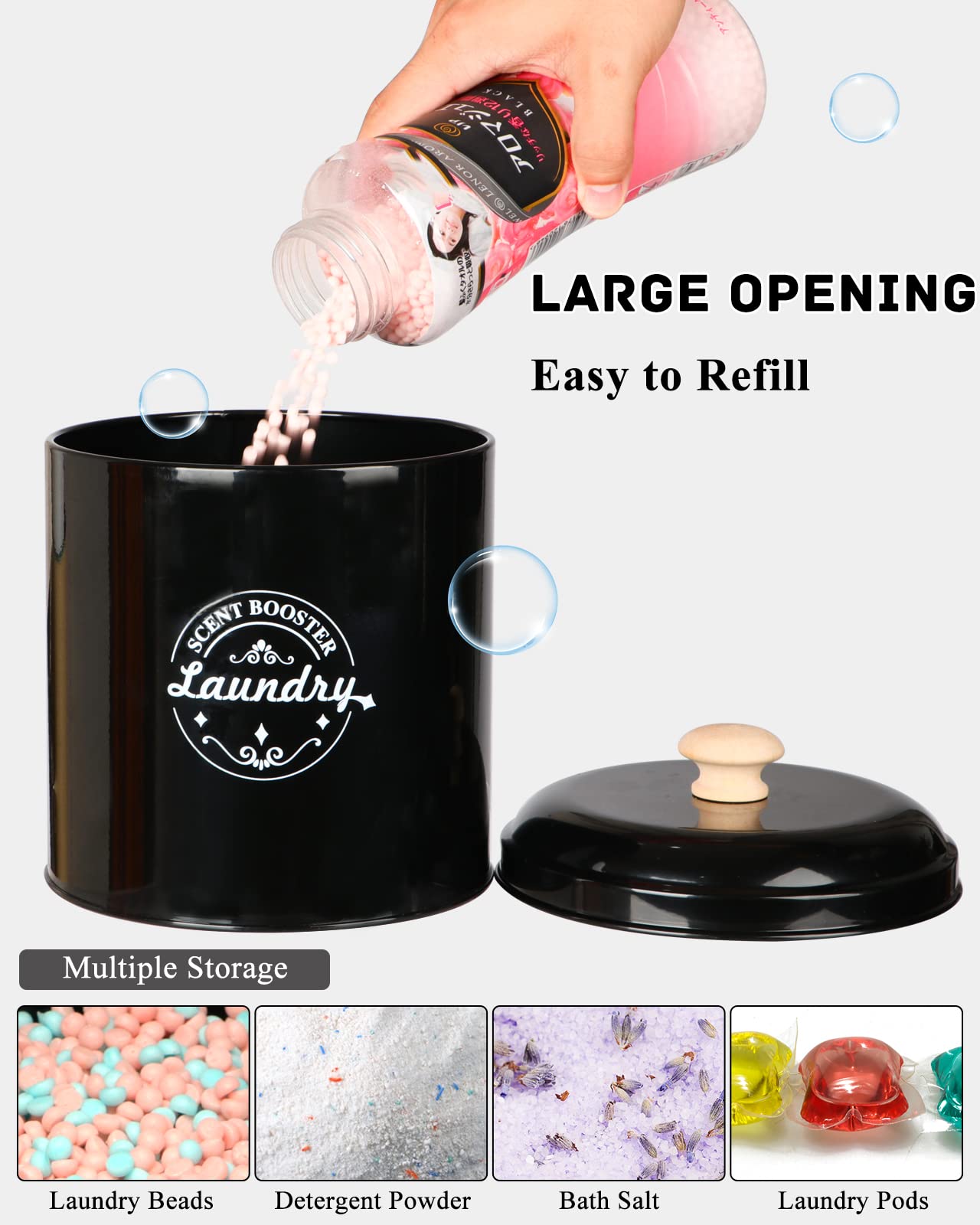 • Q: Does the dispenser come with a lid? A: Yes, the dispenser features a high-quality lid with a wooden handle to keep your laundry beads fresh and tidy.