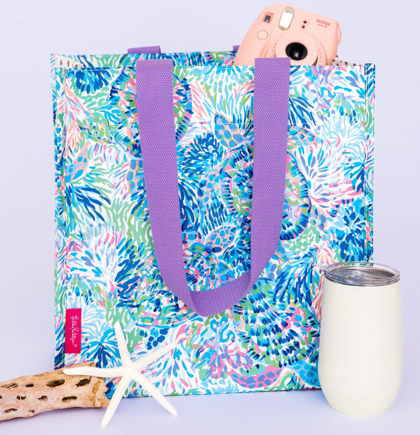 Lilly Pulitzer Purple/Blue Market Shopper Bag, Reusable Grocery Tote With Comfortable Shoulder Straps, Shell Of A Party