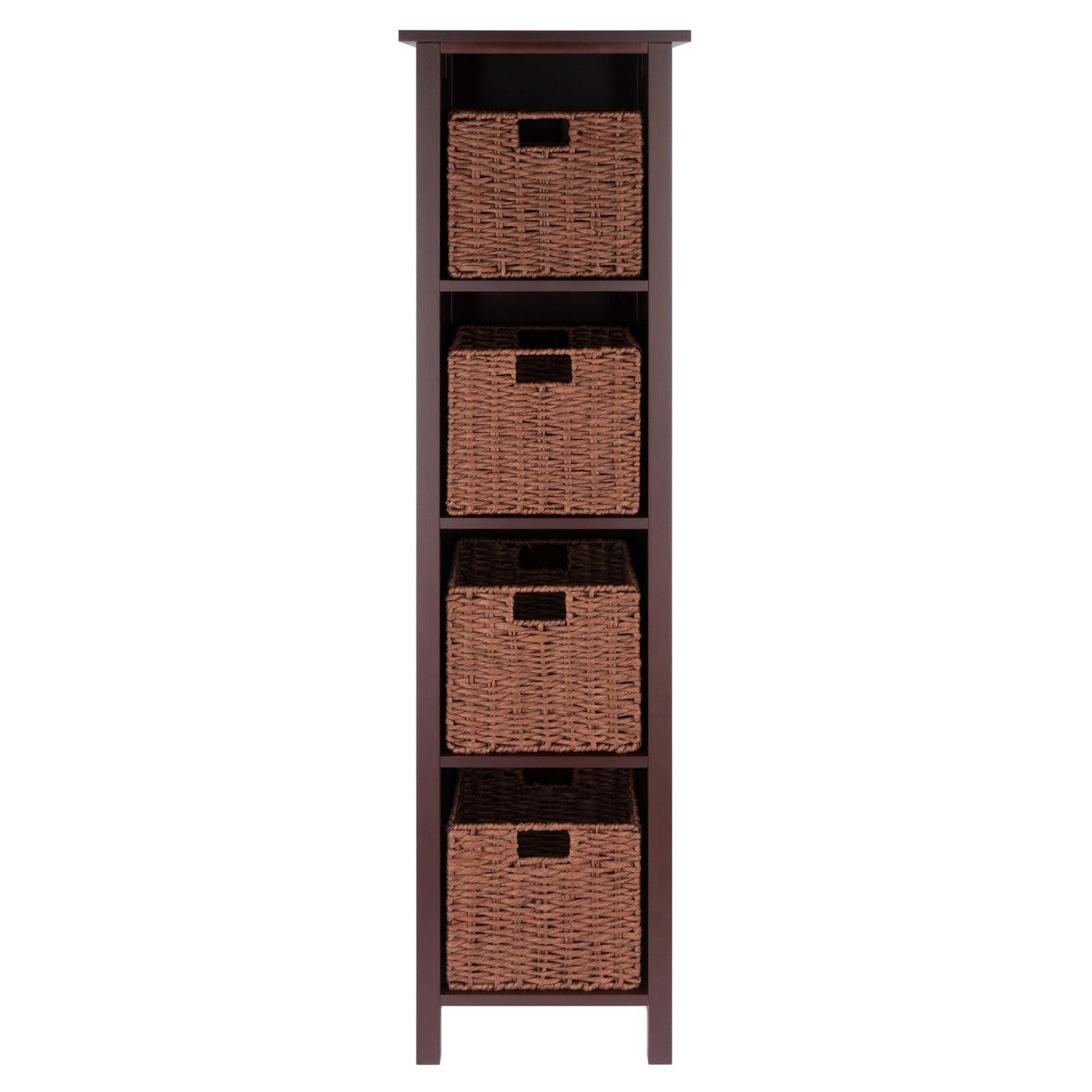 • Q: How many baskets are included with the shelf? A: The Winsome Wood Milan 5-Pc Storage Shelf includes four foldable woven baskets.