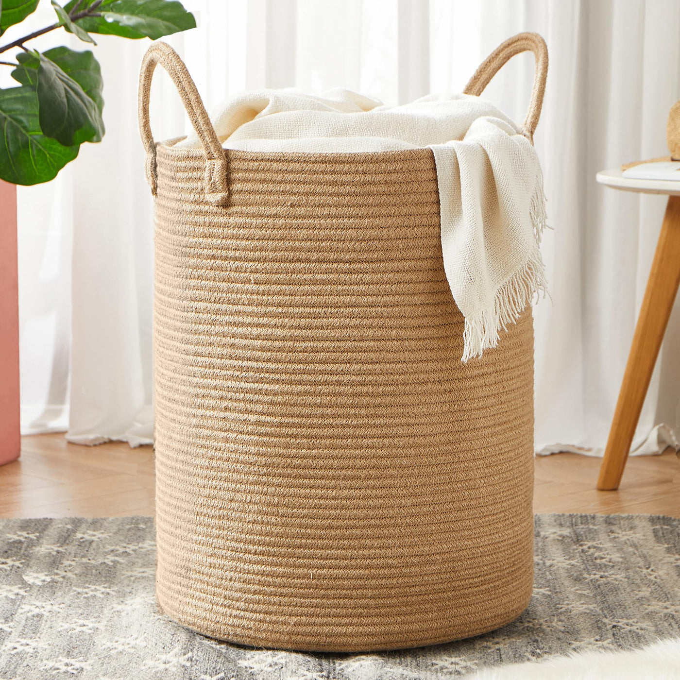 Mojoscend Jute Woven Rope Laundry Hamper Basket, 15Dx20H Inches Tall Hamper Basket For Blanket Storage, Nursery Clothes Hamper F