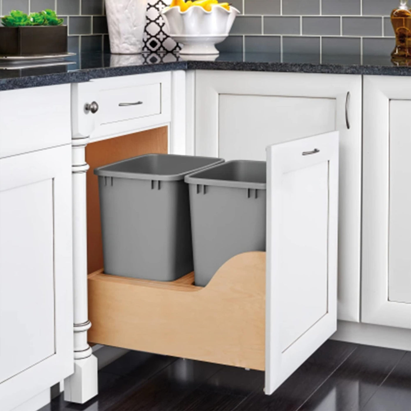 - Q: Is there an option to add lids to the trash bins? A: Yes, optional Rev-A-Shelf lids are available for purchase separately to cover the bins.