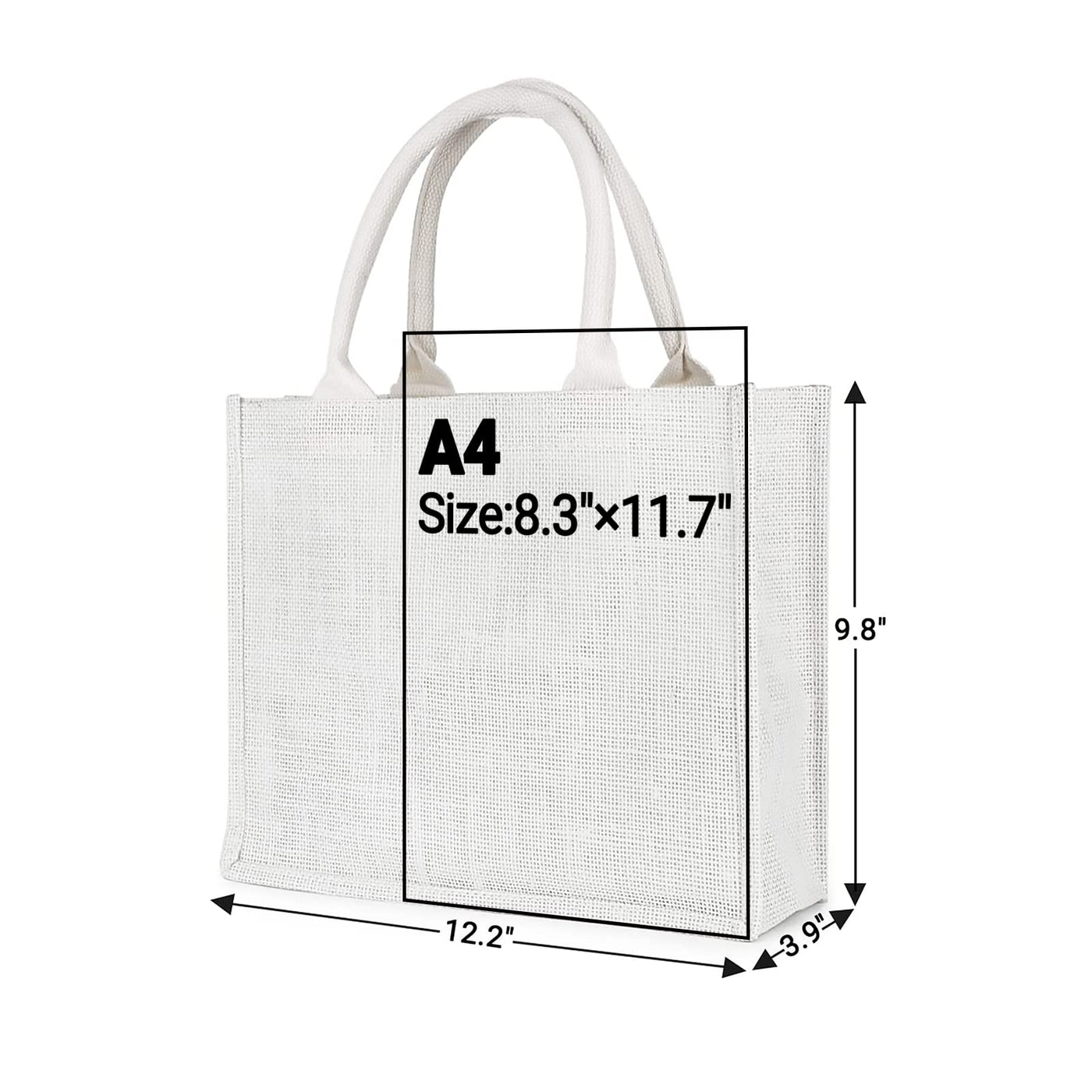 • Q: What material are the tote bags made of? A: The tote bags are made of 100% unbleached burlap, which is a durable and reusable jute fabric.