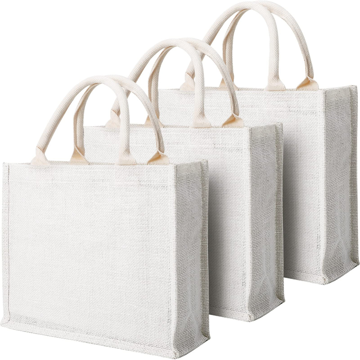• Q: How many bags come in a pack? A: Each pack contains three medium-sized white burlap tote bags.