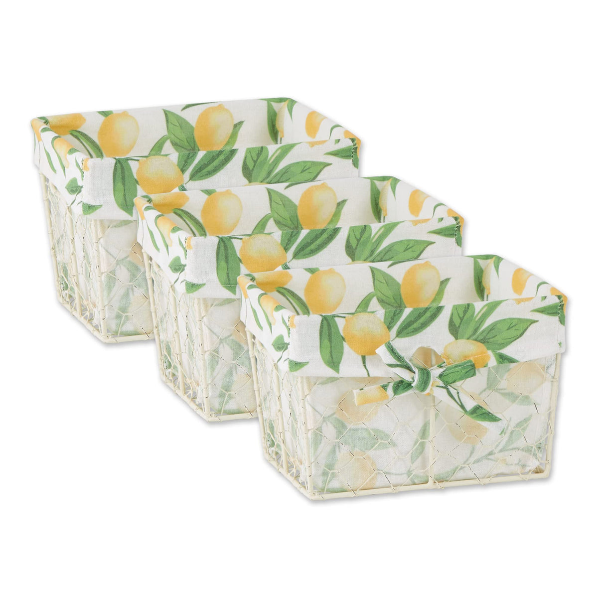 SMALL ANTIQUE WHITE CHICKEN WIRE LEMON PRINT LINER BASKET SET/3