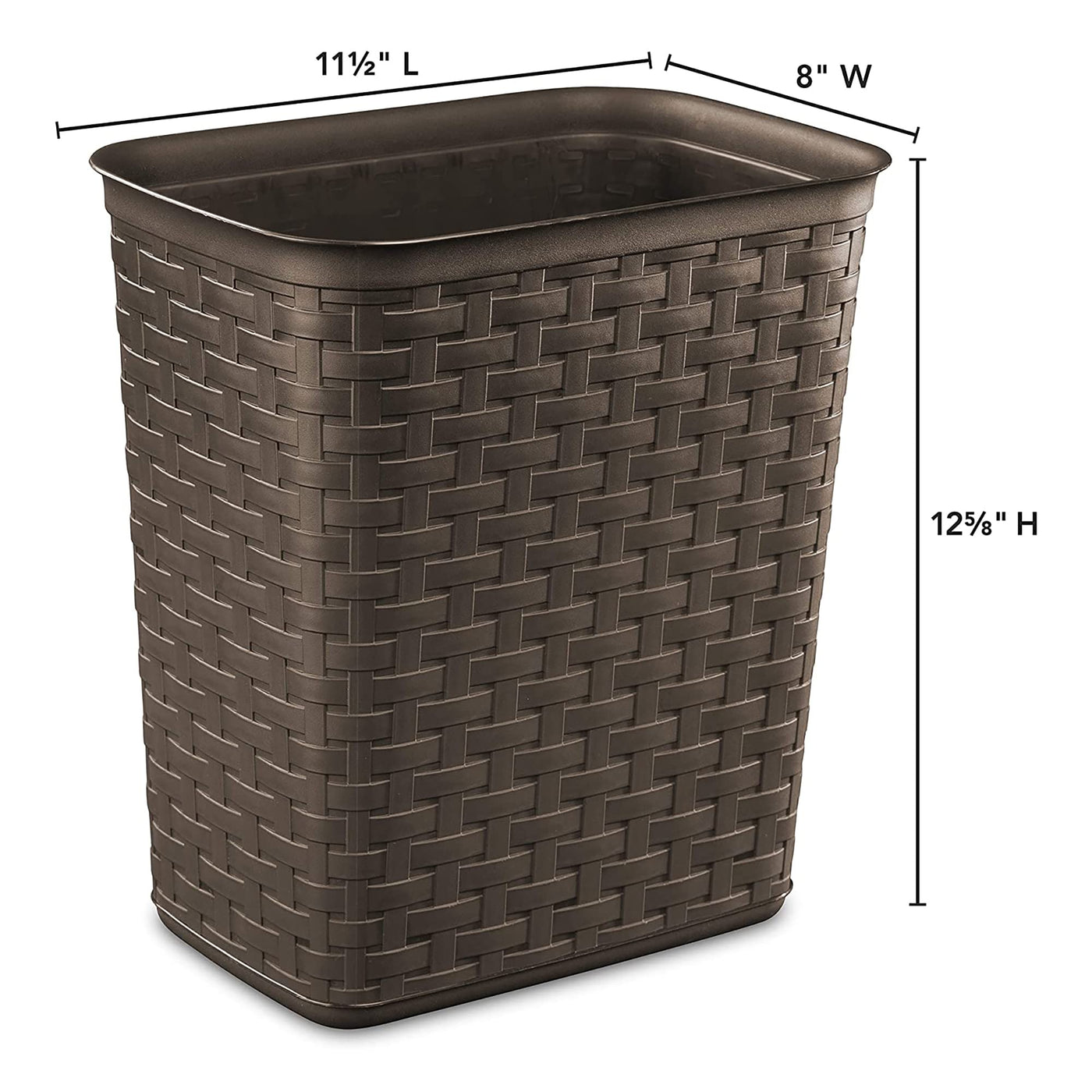 • Q: What are the dimensions of the STERILITE Wastebasket Weave Espresso? A: The STERILITE Wastebasket Weave Espresso measures 8 inches in width and 12-5/8 inches in height.