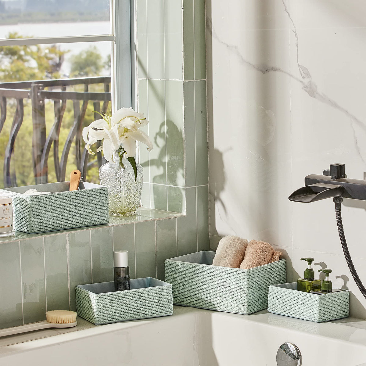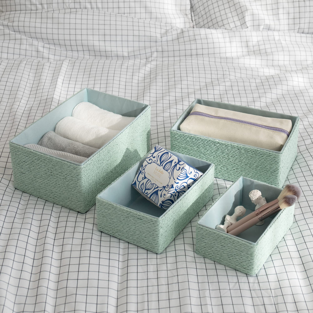 Storage Baskets Set 4 - Stackable Woven Basket Paper Rope Bin, Storage Boxes For Makeup Closet Bathroom Bedroom (Light Green)
