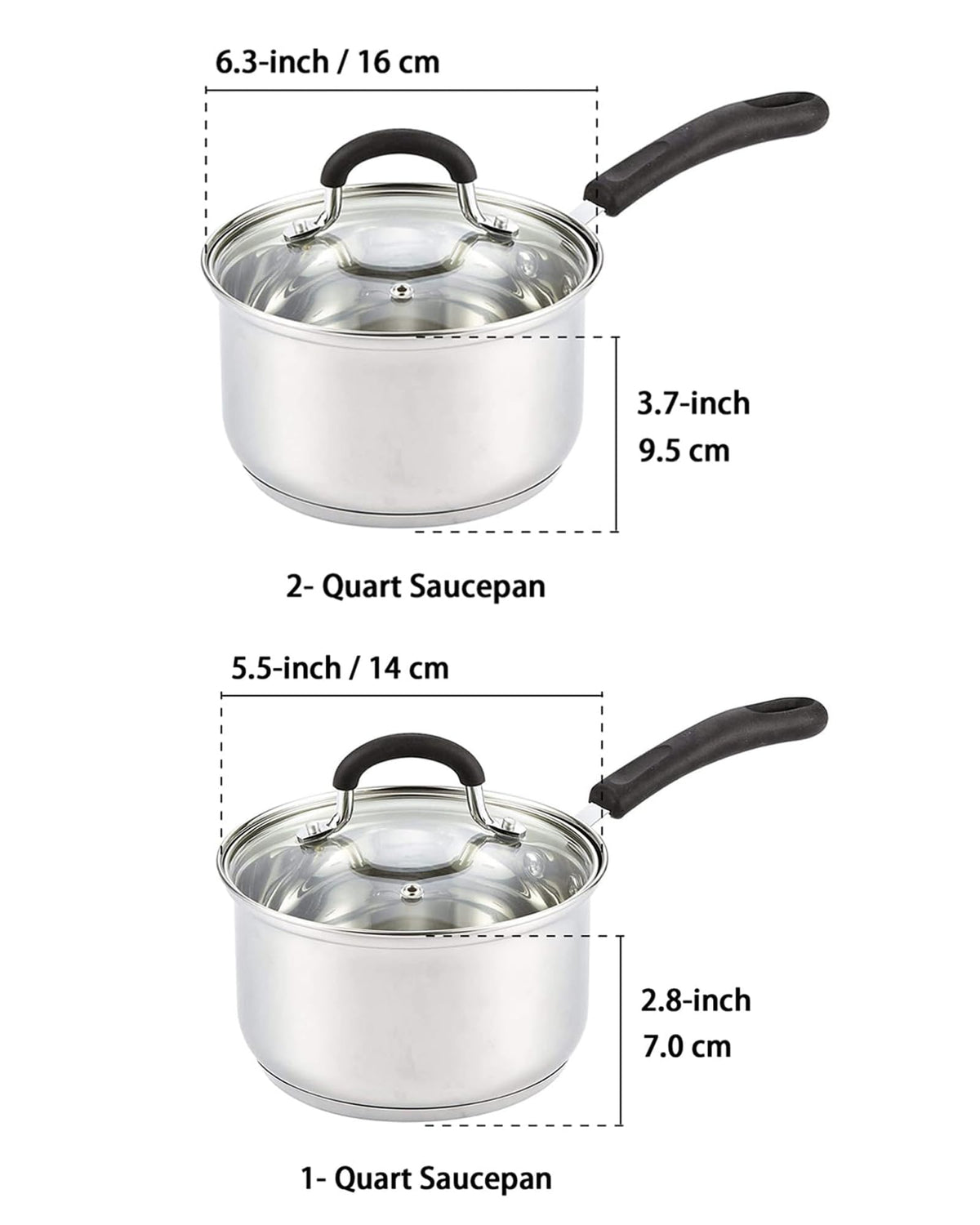 • Q: What sizes are included in the saucepan set? A: The Cook N Home saucepan set includes a 1-quart sauce pot and a 2-quart saucepan, both equipped with tempered glass lids.