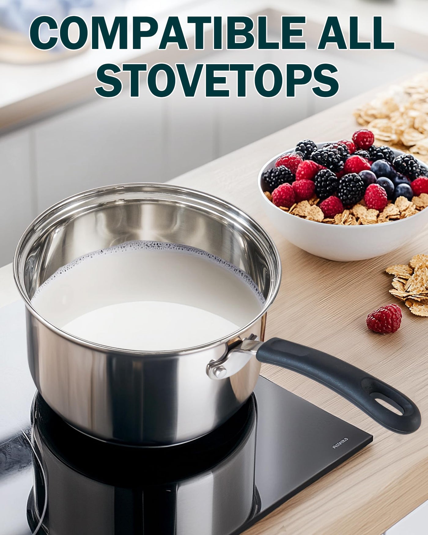 • Q: Is the saucepan set compatible with induction cooktops? A: Yes, the saucepan set features a magnetic stainless bottom design that makes it suitable for use on induction cooktops, as well as gas, electric, glass, ceramic, and halogen stovetops.