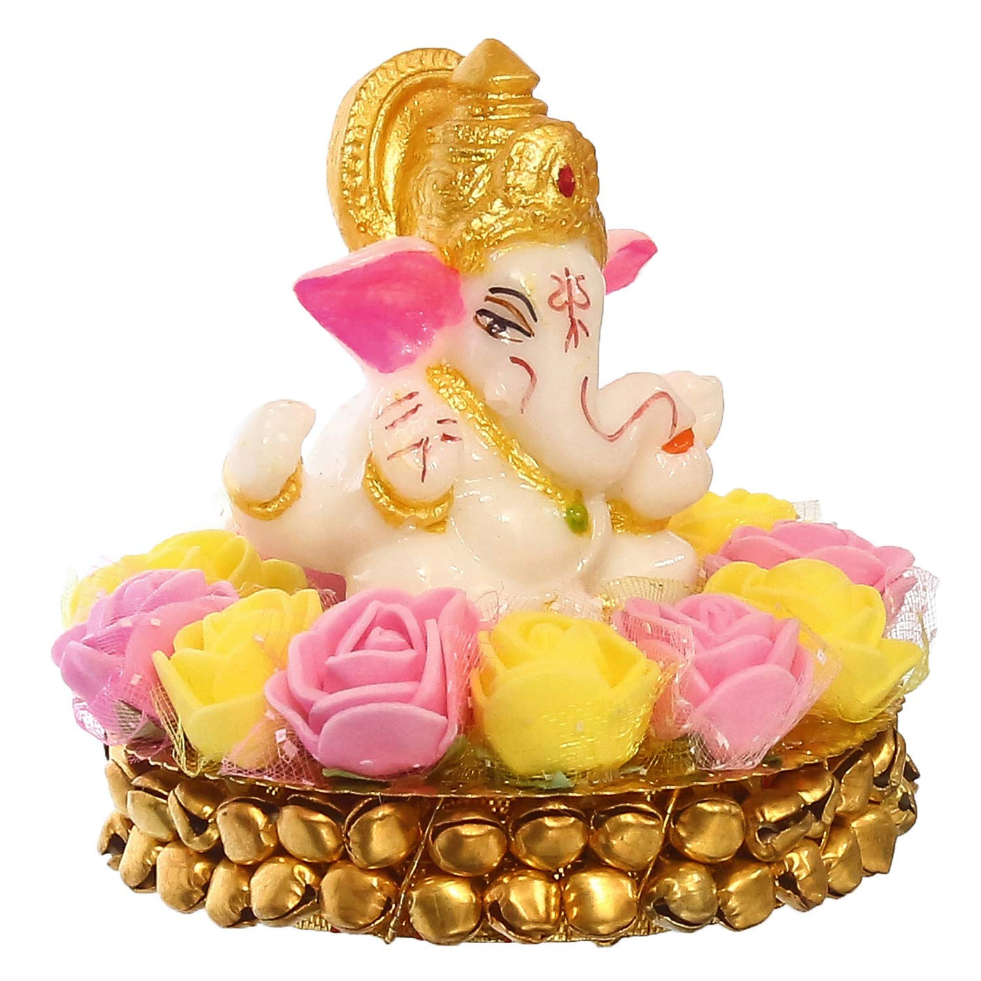 eCraftIndia Lord Ganesha Idol on Decorative Handcrafted Plate with Pink and Yellow Flowers