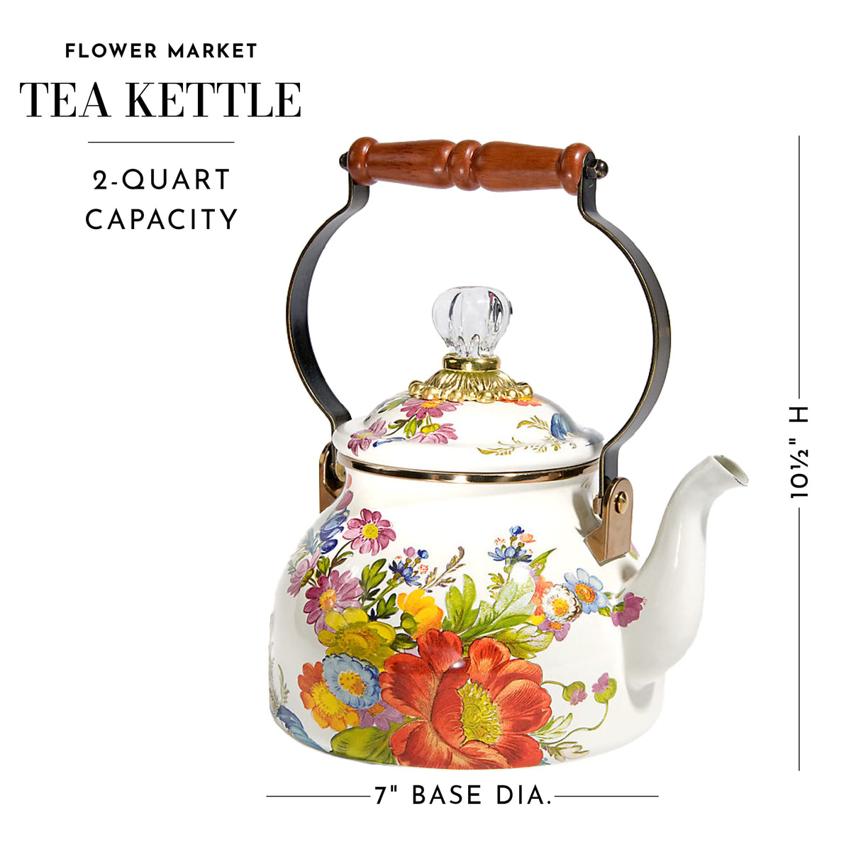 - Q: What is the capacity of the MacKenzie-Childs Flower Market Enamel Tea Kettle? A: The MacKenzie-Childs Flower Market Enamel Tea Kettle has a capacity of 2 quarts.