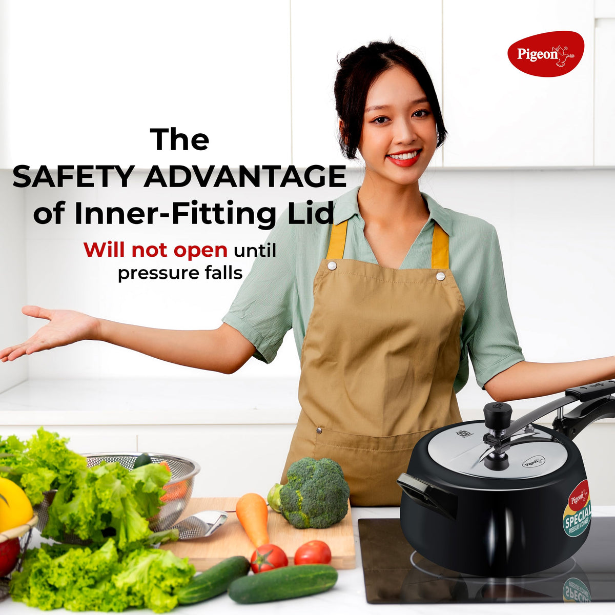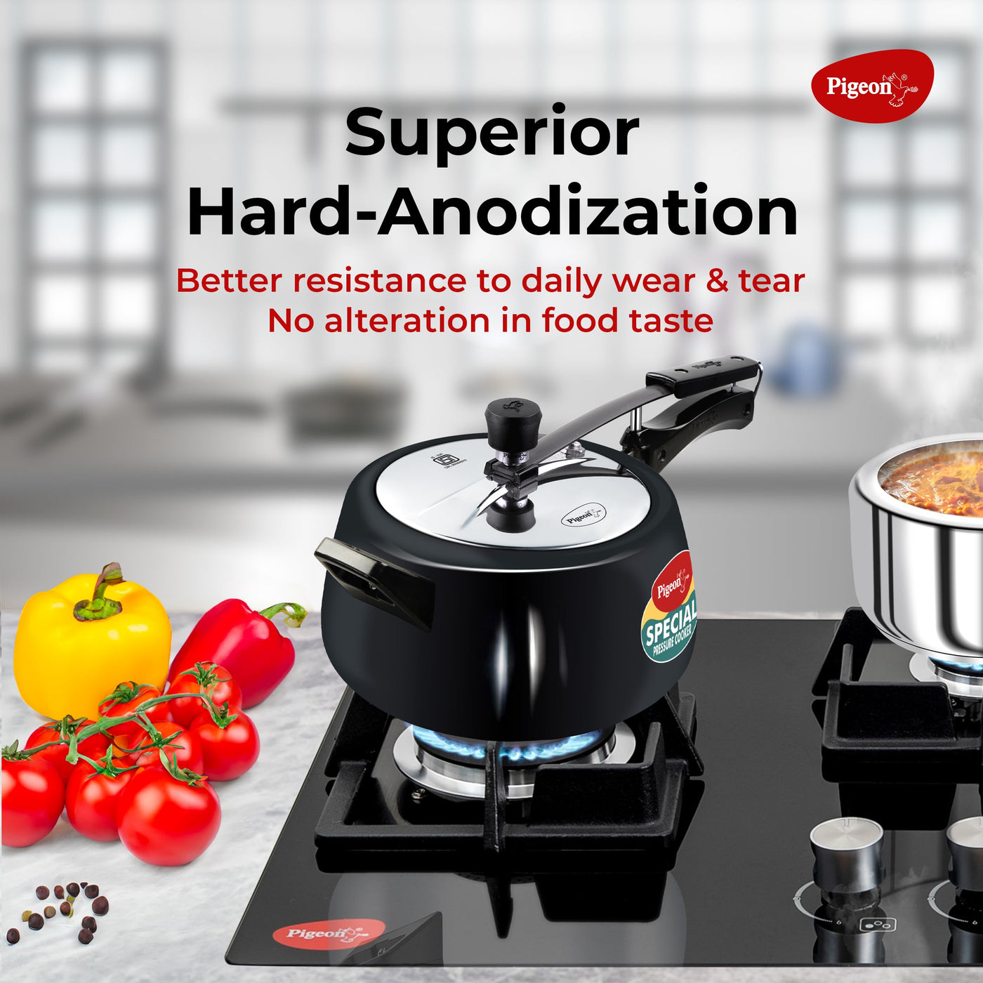 DescriptionPigeon Induction Base Hard Anodised Aluminium Inner Lid Pressure Cooker 5 Litre is multi-top compatible. Therefore, it can be used on standard gas, induction, halogen, electric, and ceramic cooktops. The base of the cooker remains flat without bulging or becoming concave. This ergonomic pressure cooker maintains its gleam without corroding, which is an indication of its durability. The cooker is easy to clean and simple to maintain. Prepare wholesome and nutritious meals for your loving family and friends