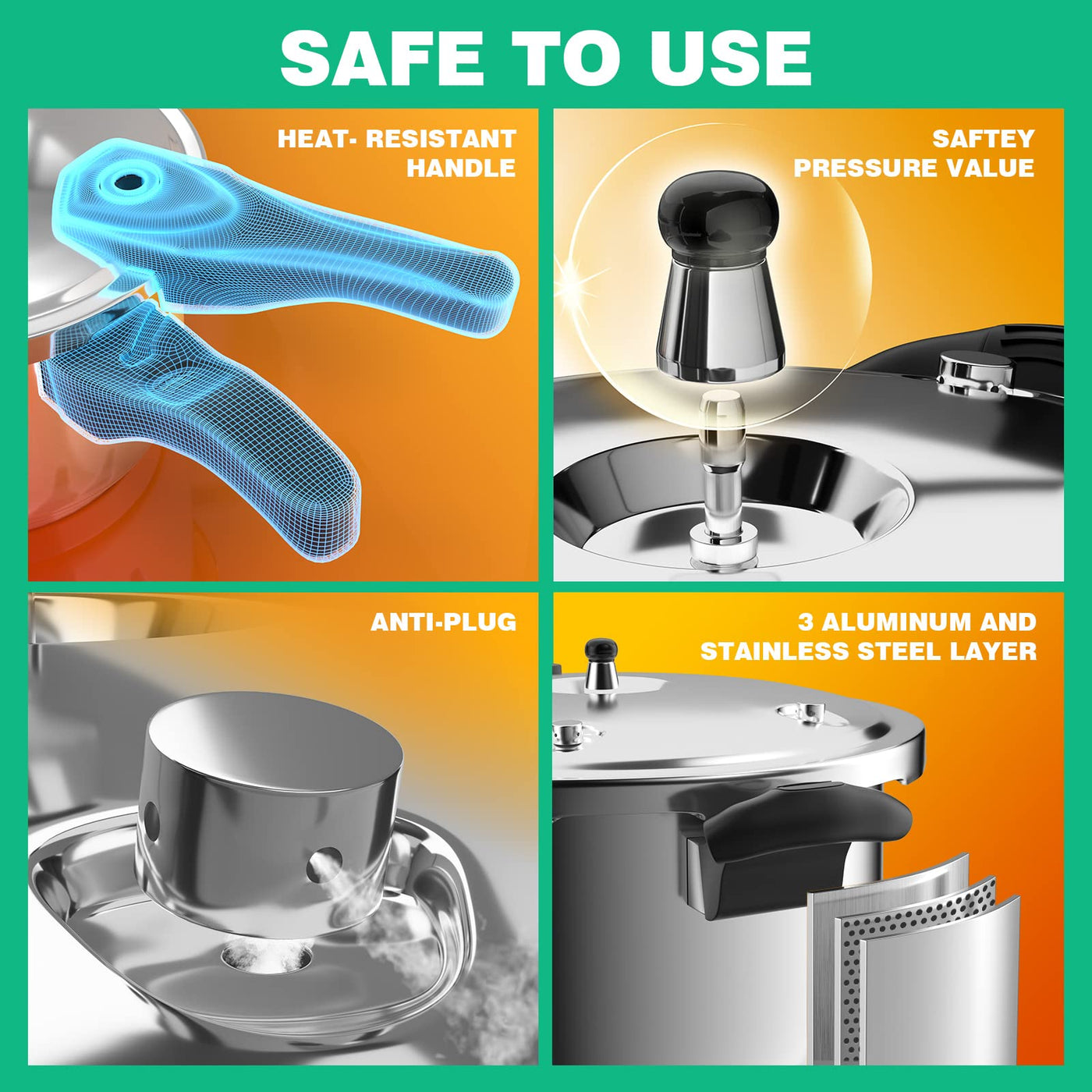 • Q: Is this pressure cooker safe to use? A: Yes, the pressure cooker features multiple safeguard devices, including a spring valve that automatically relieves pressure when it exceeds safety limits, ensuring safe use.