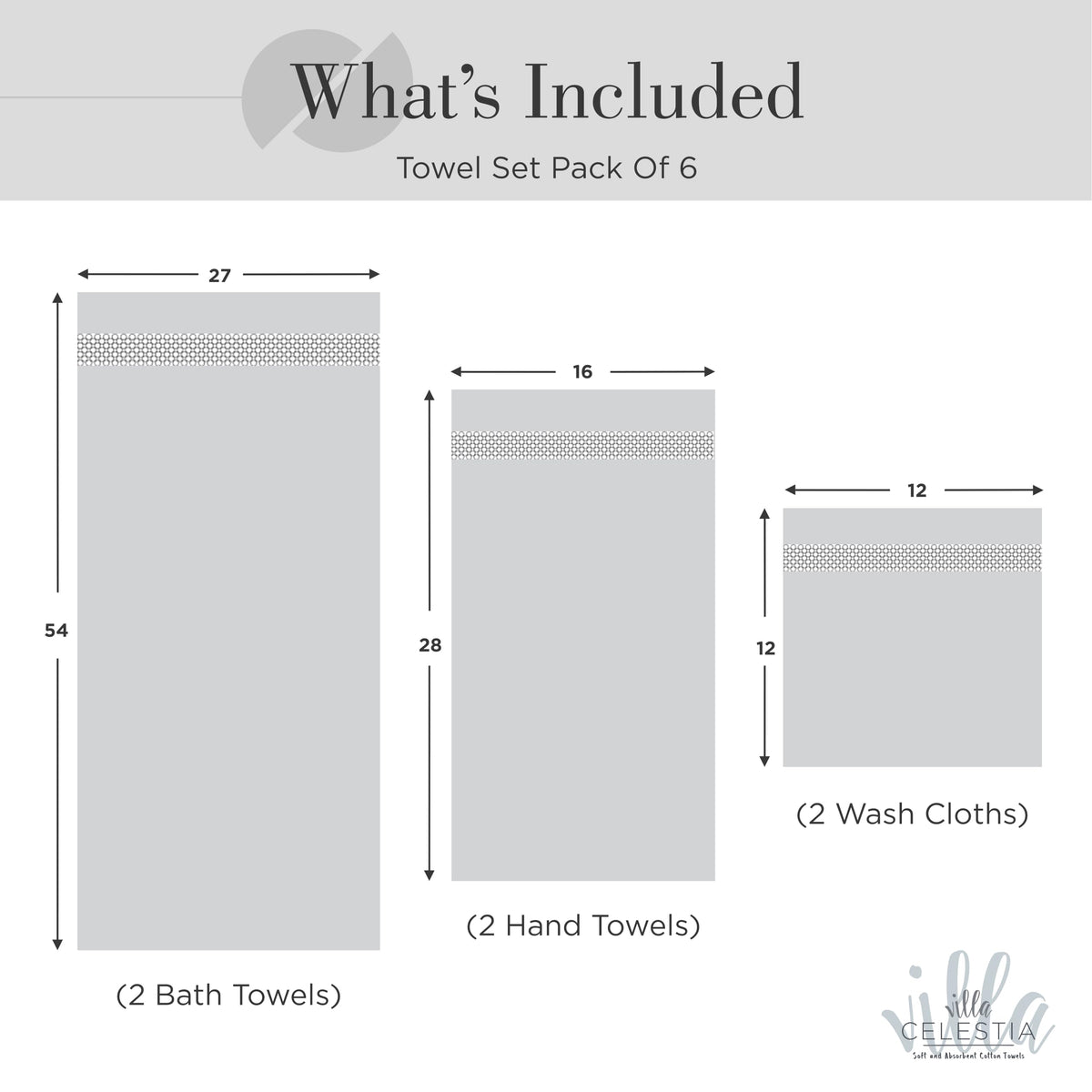 - Q: How many towels are included in the set? A: The set includes a total of 6 towels: 2 bath towels, 2 hand towels, and 2 washcloths.