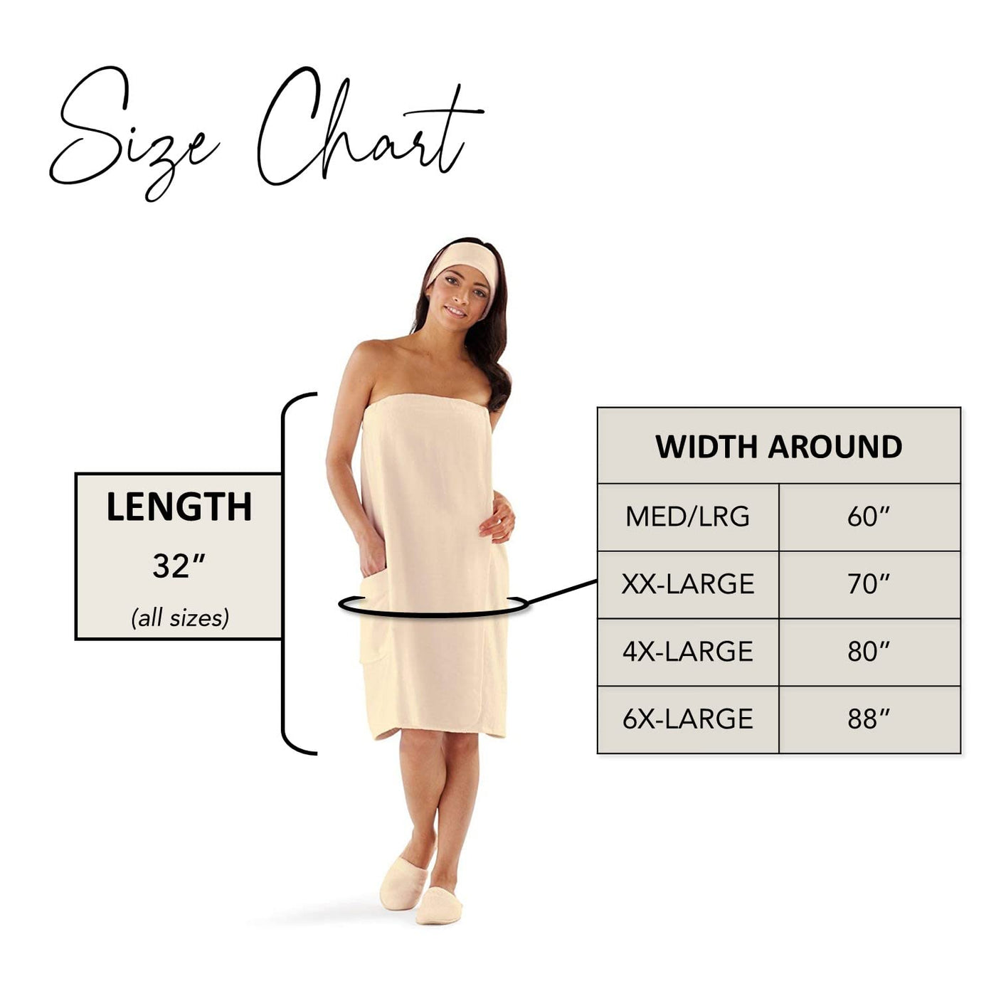 • Q: What sizes are available for the Boca Terry Women's Spa Wrap? A: The wrap is available in Medium/Large and also in Plus Sizes: Extra Extra Large (XXL) and XXXXL (4XL). All womens wraps are 32 inches in length.