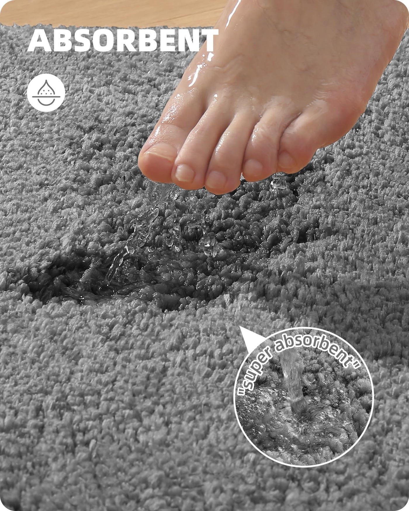 - Q: Is the bathroom rug absorbent? A: Yes, the dense microfiber pile of the rug is designed to soak up a lot of water, keeping your bathroom floor dry.