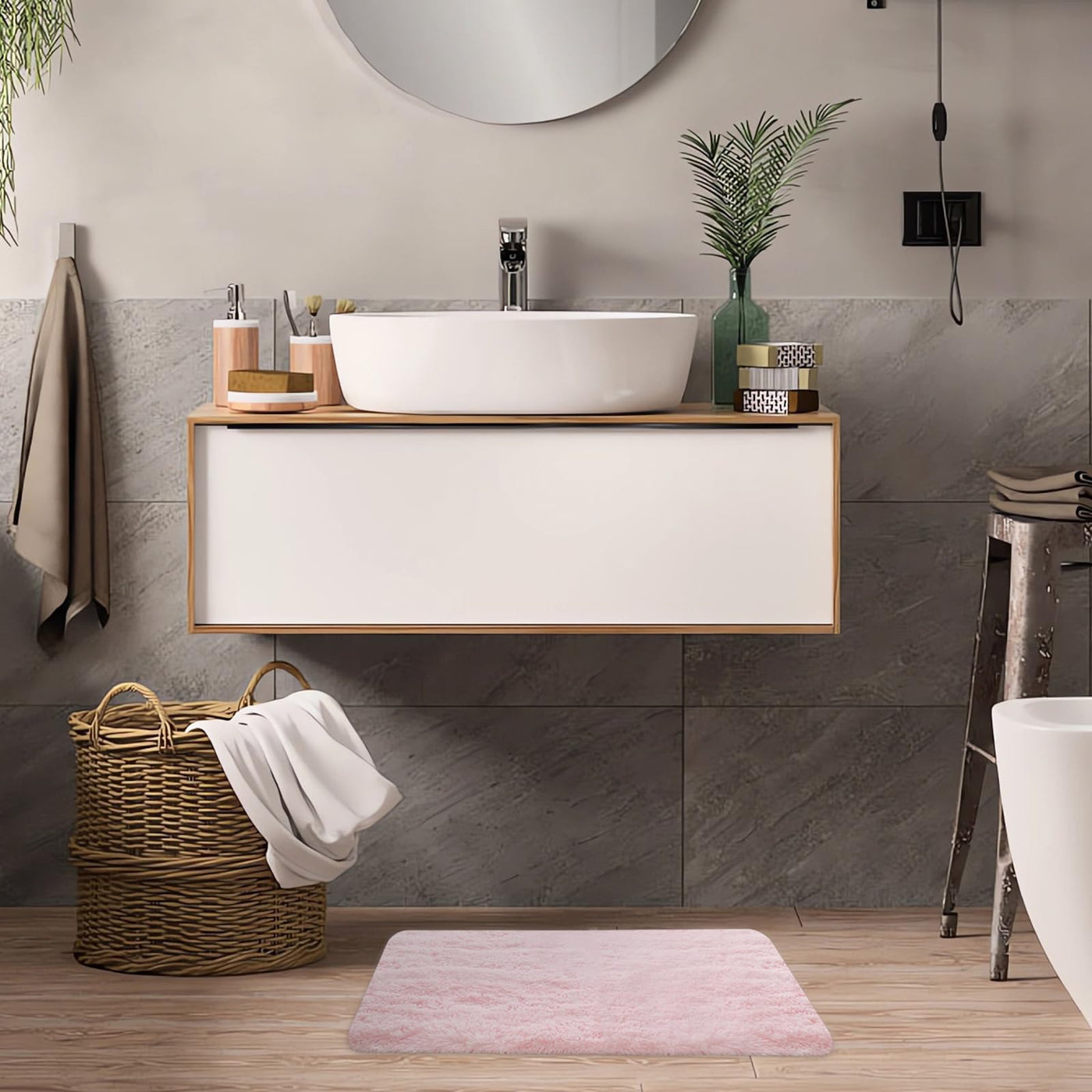 • Q: What material is the ConCus-T Pink Bath Mat made of? A: The ConCus-T Pink Bath Mat is crafted from a high-quality polyester blend, providing a soft and luxurious feel.