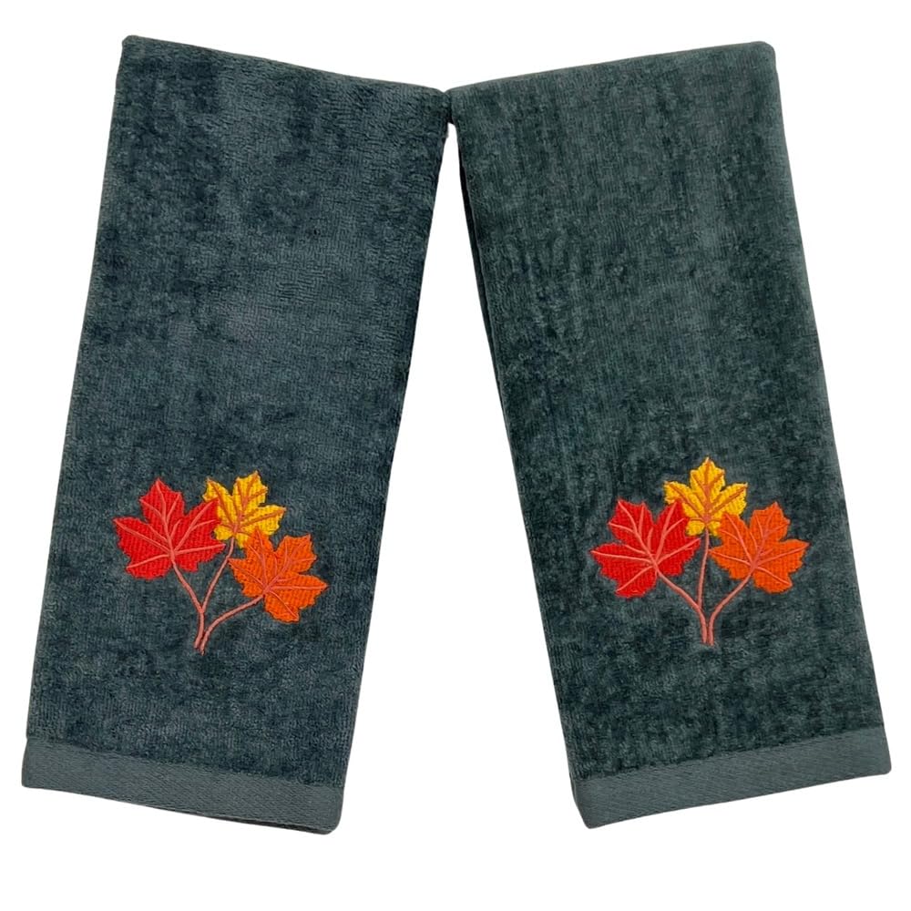 - Q: What design features do these towels have? A: The towels feature beautiful autumn-themed embroidery with vibrant red, orange, and yellow maple leaves against a plush grey background.