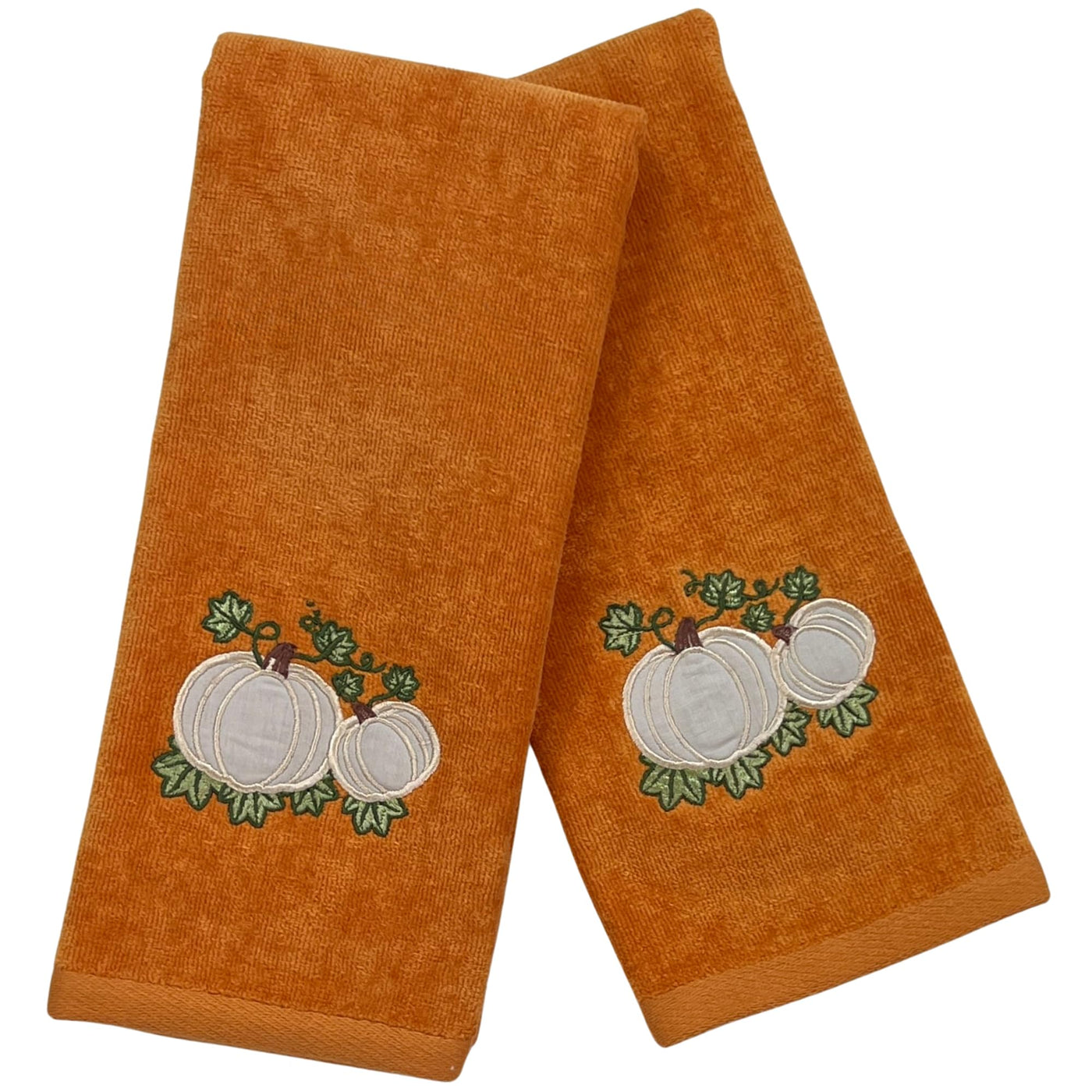 • Q: What design features do these towels have? A: The towels feature a charming white pumpkin appliqué with delicate green leaf embroidery, perfect for autumn decor.