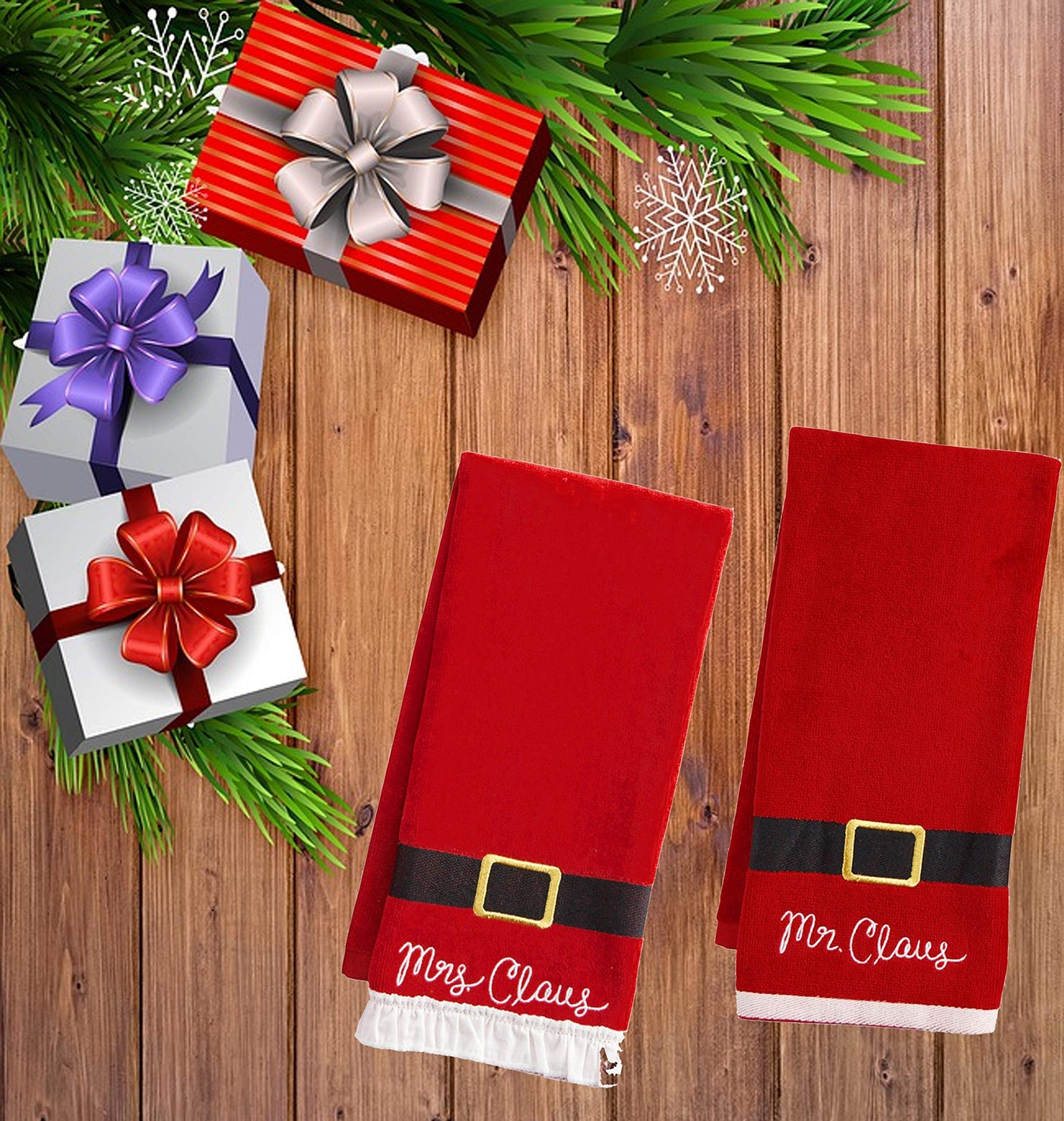 • Q: What designs are featured on the towels? A: One towel features an embroidered Mrs. Claus with a white ruffled border, while the other features Mr. Claus with a red and white solid border.