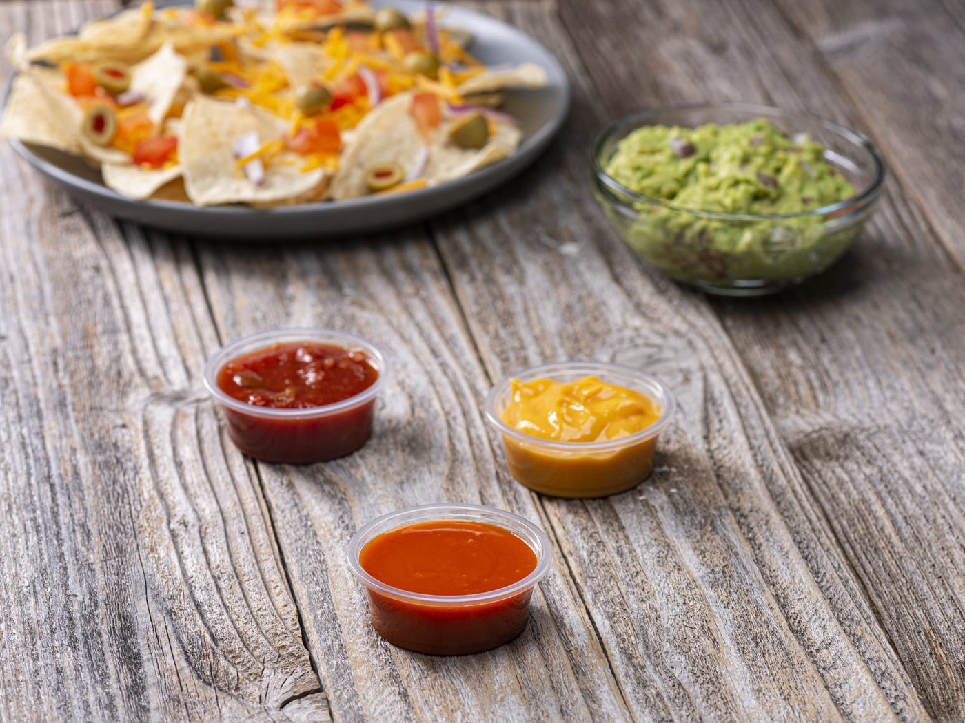 - Q: What are the dimensions of each portion cup? A: Each portion cup has a capacity of 1.5 ounces.