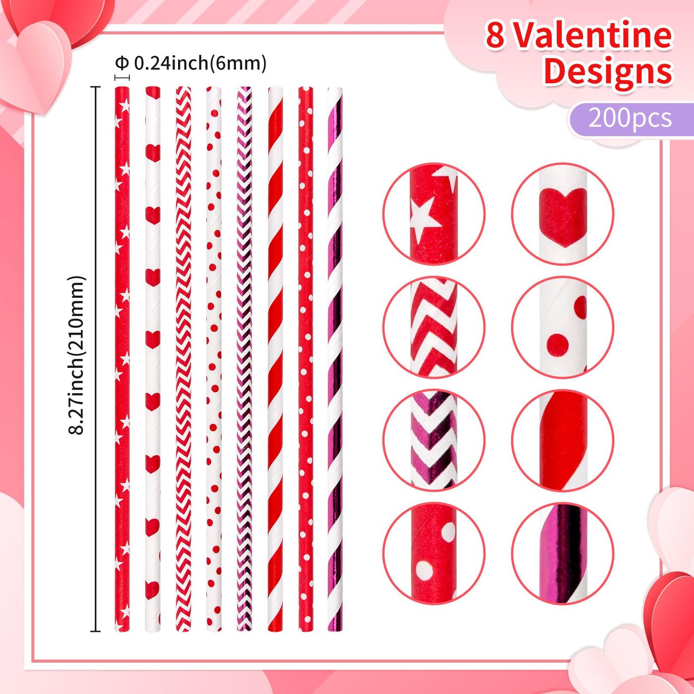 [200 Pack] Paktalk Valentine Paper Straws, 8 Assorted Red White Paper Straws With Strips Dots Waves Stars Metallic Rose Gold Pap