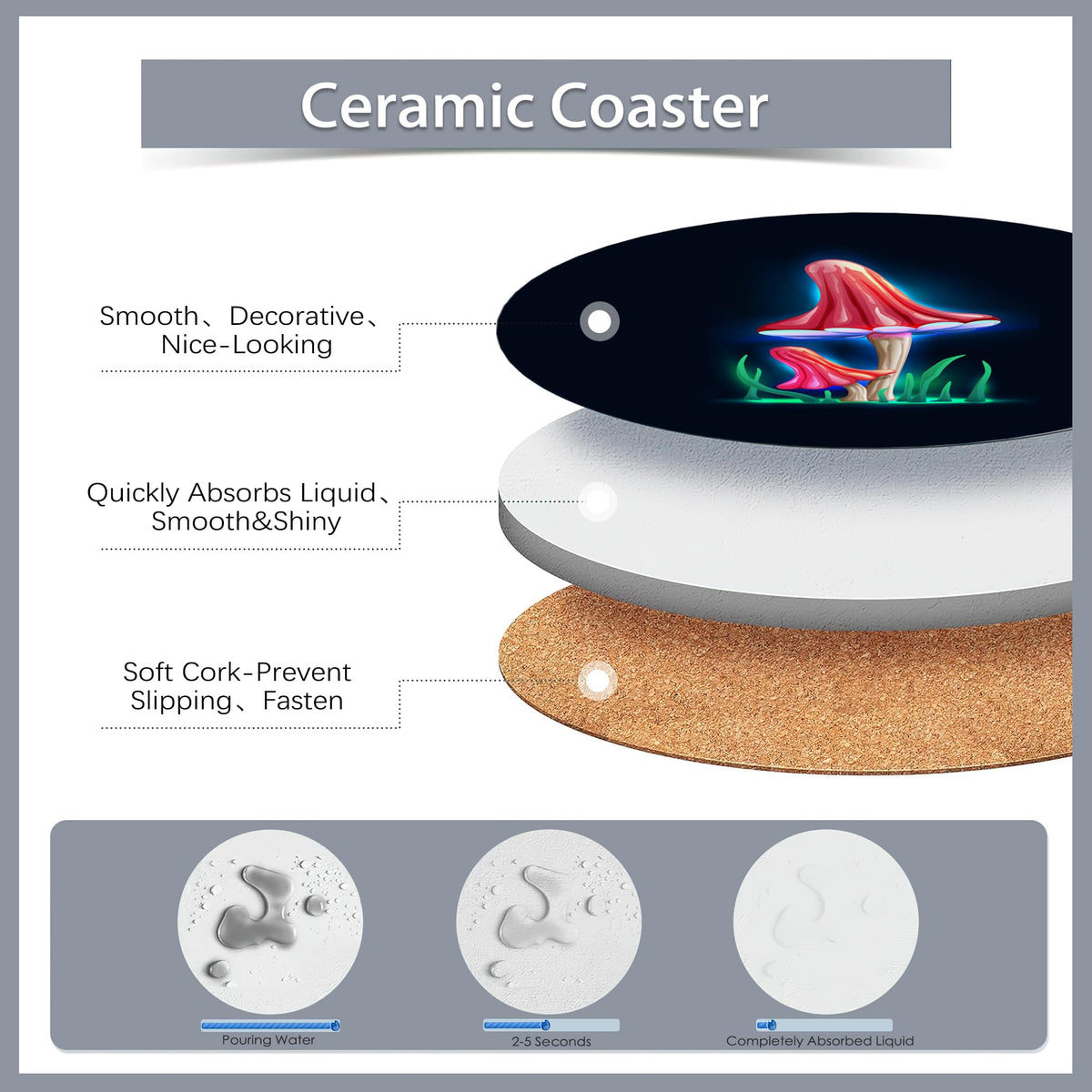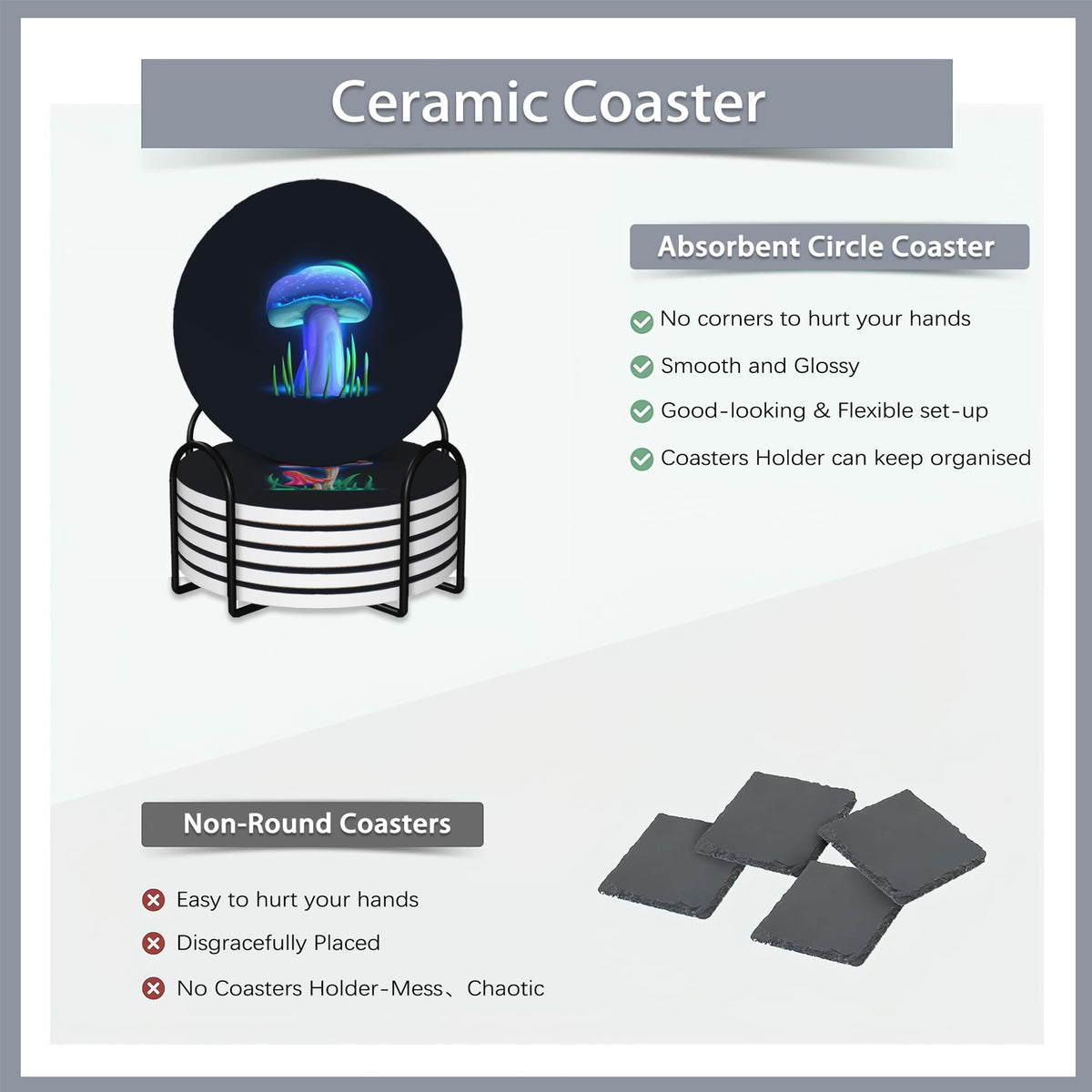 - Q: Do these coasters have any decorative features? A: Yes, the coasters feature a magical glowing mushroom design, adding a unique touch to your home decor.