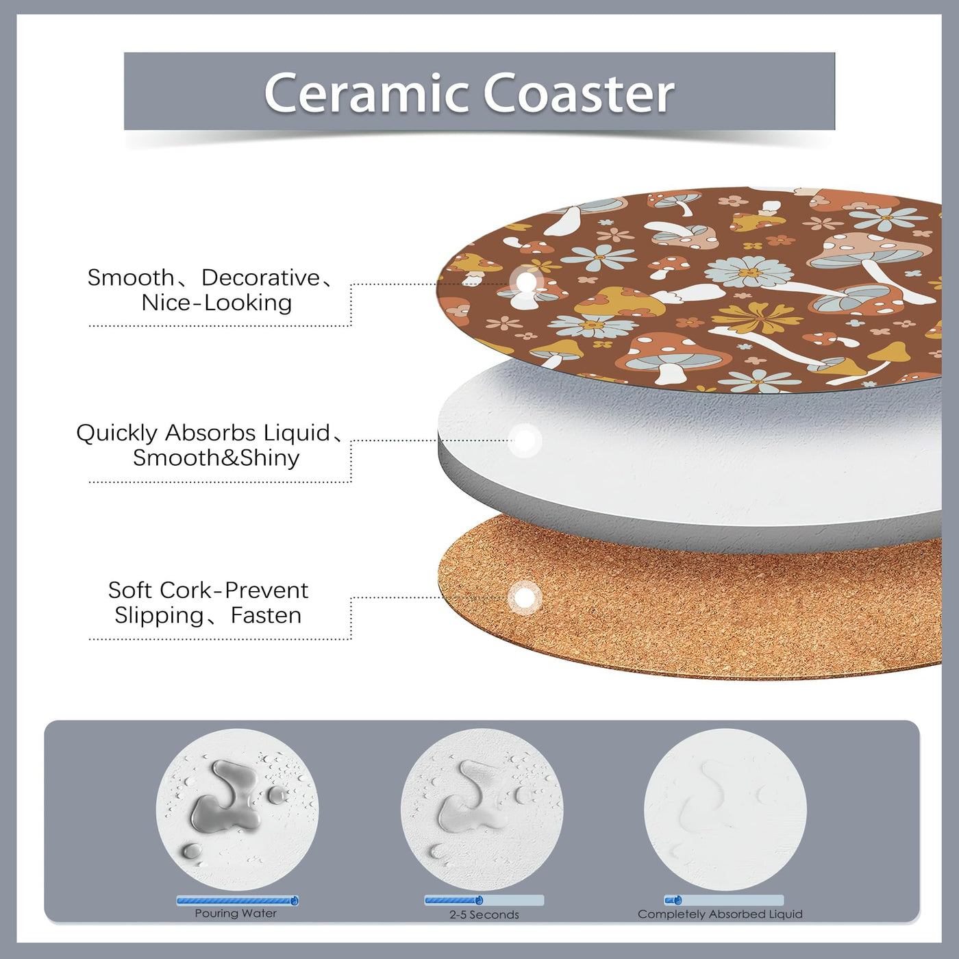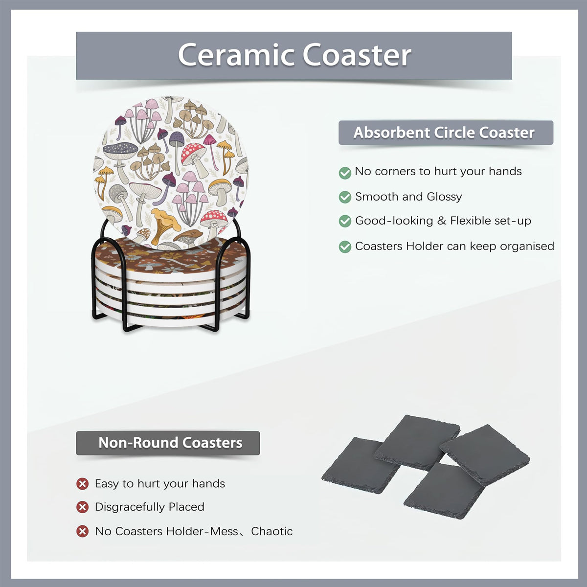 • Q: What materials are the coasters made from? A: The coasters are made from ceramic with a cork backing to prevent scratching surfaces.