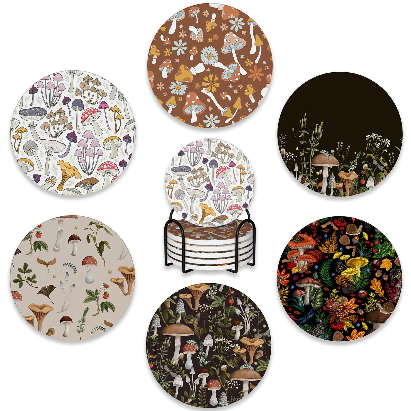 6 Pcs Coasters For Drinks With Holder,Retro Mushrooms Berries And Bugs Absorbent Coaster With Cork Backing,Great Gift For Housew