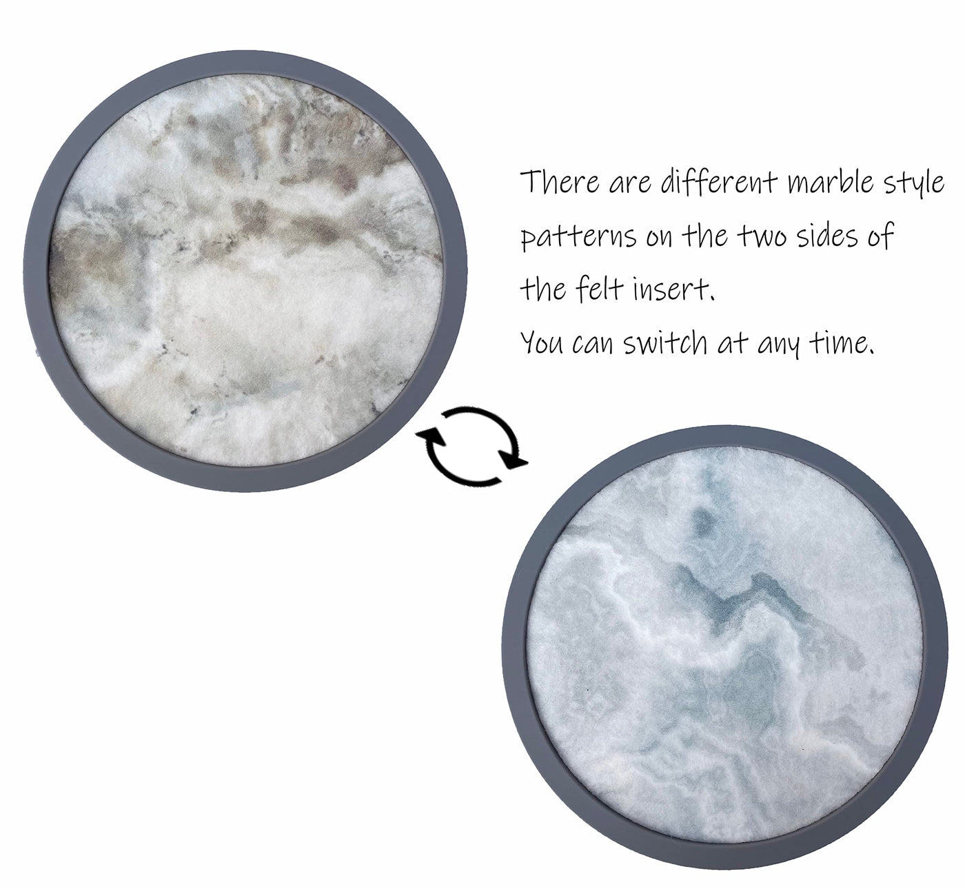 - Q: What styles or patterns do the felt inserts have? A: The felt inserts feature different marble patterns on both sides.