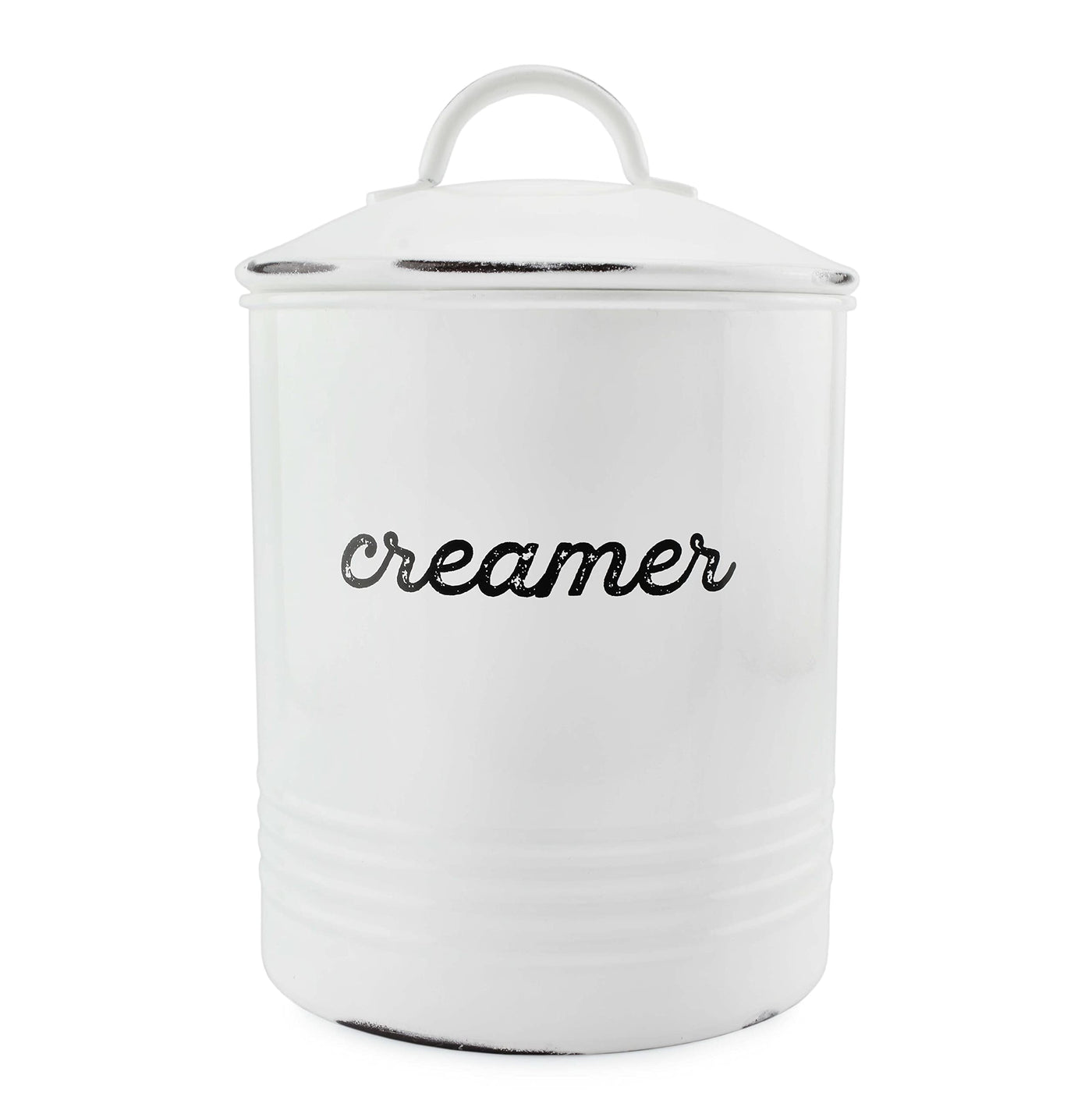 - Q: What style does the AuldHome Creamer Canister feature? A: The canister features a rustic farmhouse style with distressed white enamel and black script, making it a charming addition to any kitchen.