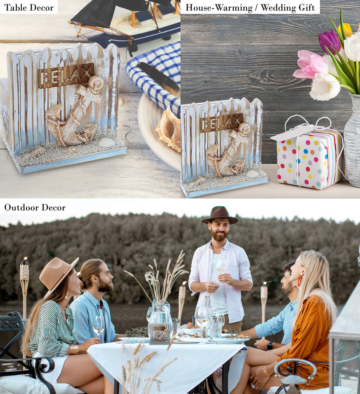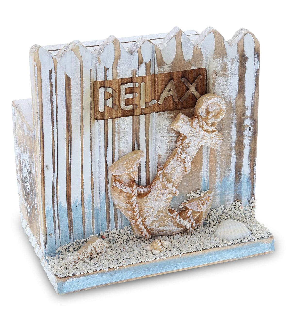 - Q: Is the coaster holder designed with any decorative elements? A: Yes, the coaster holder features a cute anchor design and a 'Relax' sign etched on the top side, adding to its nautical theme.