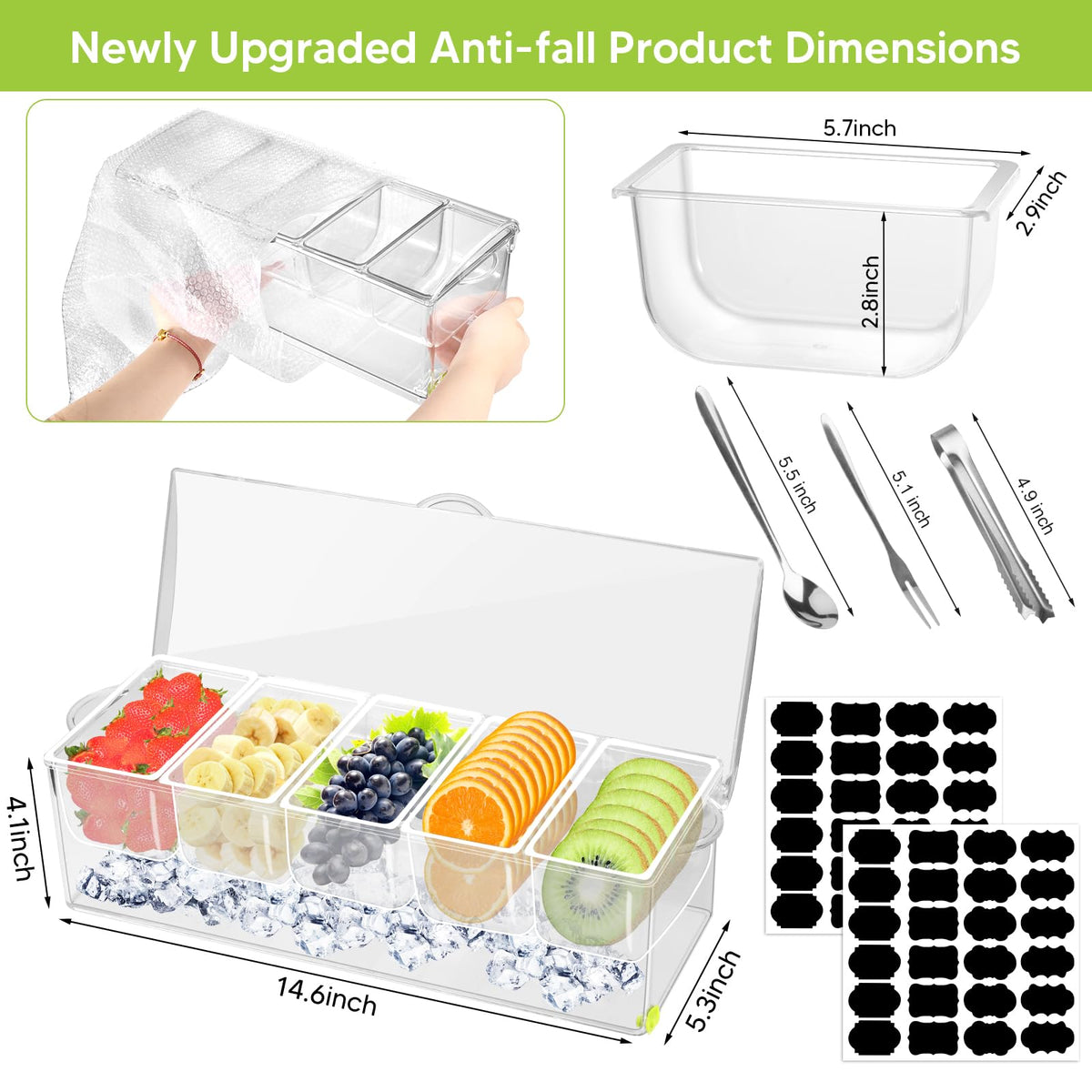 • Q: What is included in the package? A: The package includes the 5 Compartment Condiment Server, 2 sheets of stickers, 5 stainless steel tongs, 5 stainless steel serving spoons, and 5 stainless steel fruit forks.