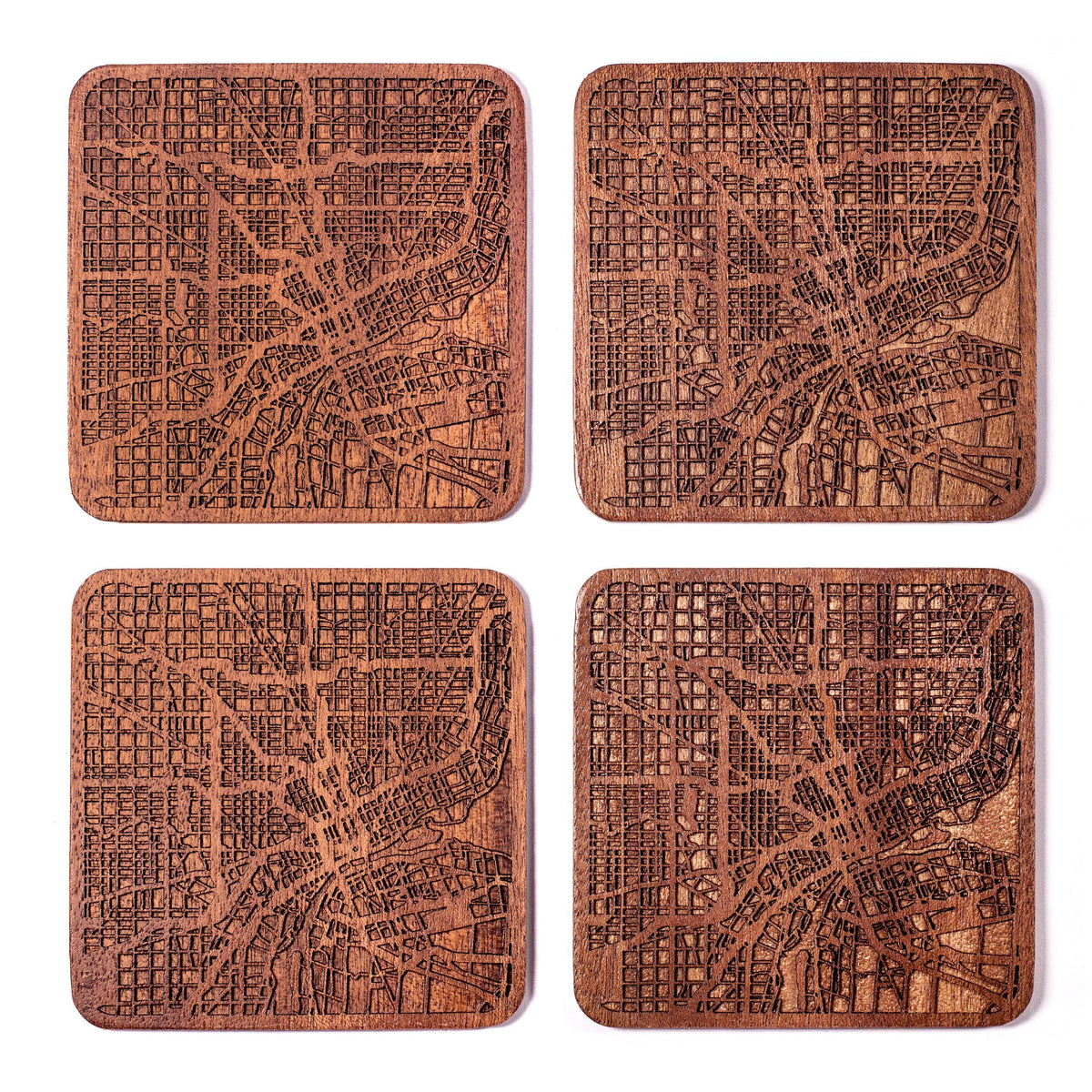 Detroit Map Coaster By O3 Design Studio, Set Of 4, Sapele Wooden Coaster With City Map, Handmade