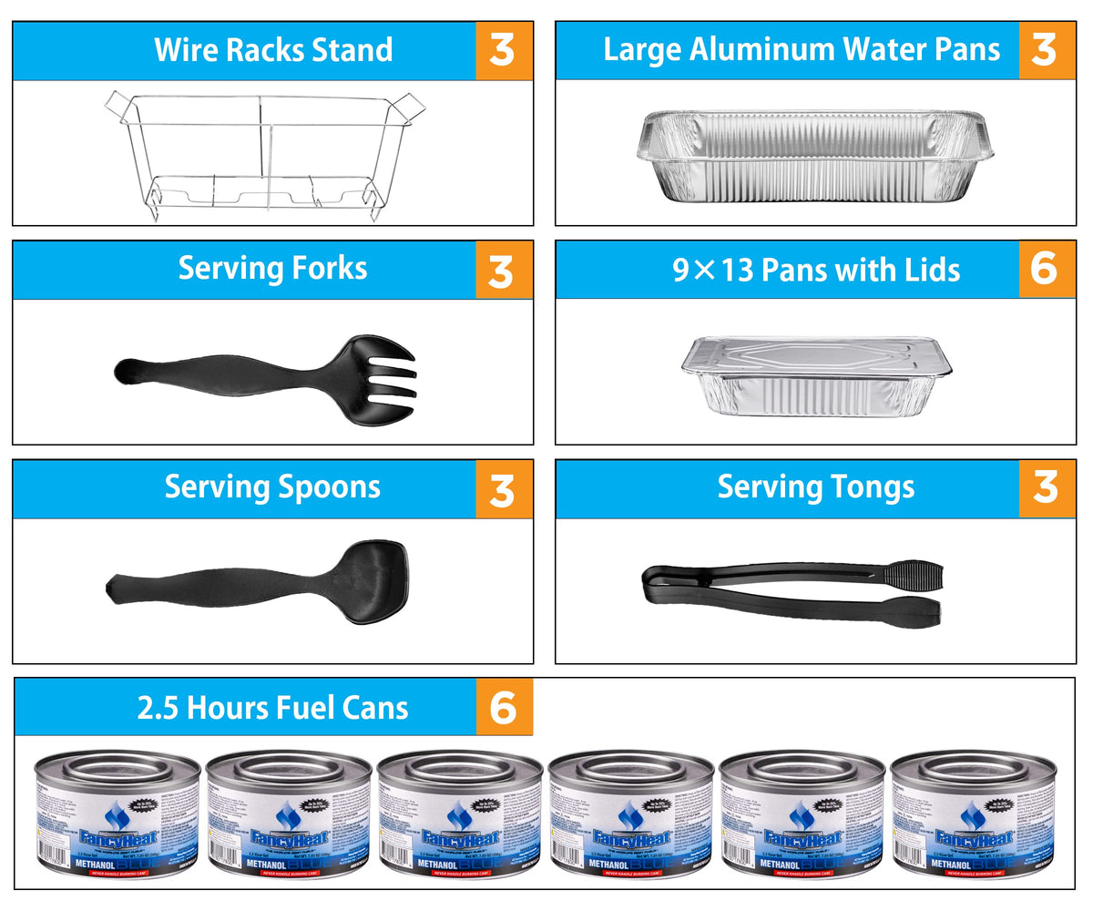 - Q: What is included in the Disposable Chafing Dish Buffet Set? A: The Disposable Chafing Dish Buffet Set includes 39 pieces: 3 chafing dish wire racks, 3 full-size aluminum water pans, 6 half-size food pans, 6 foil lids, 9 serving utensils (3 forks, 3 spoons, 3 tongs), and 6 gel cans that last up to 2.5 hours each.