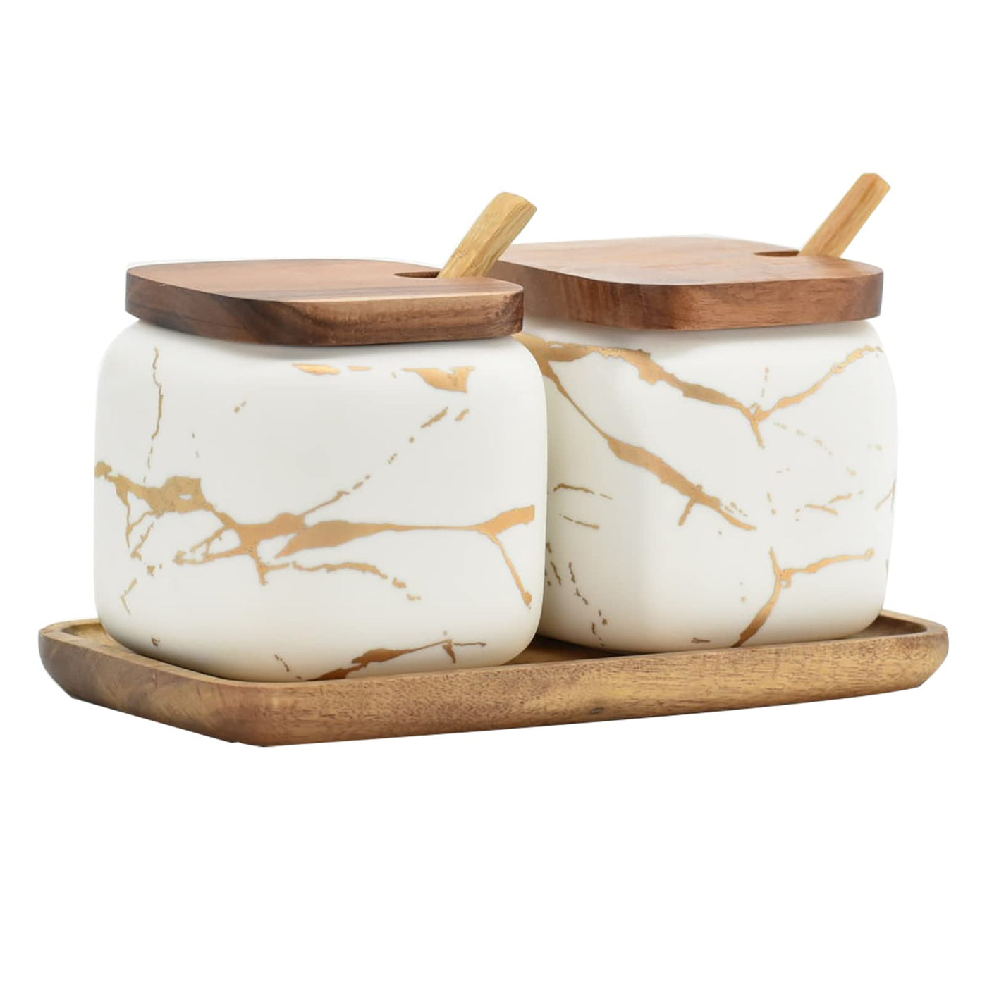 Eimquvw Sets Of 2 Marble Ceramic Seasoning Jars Ceramic Sugar Salt Bowl Condiment Pots With Wooden Lids,Wooden Spoon And Wooden
