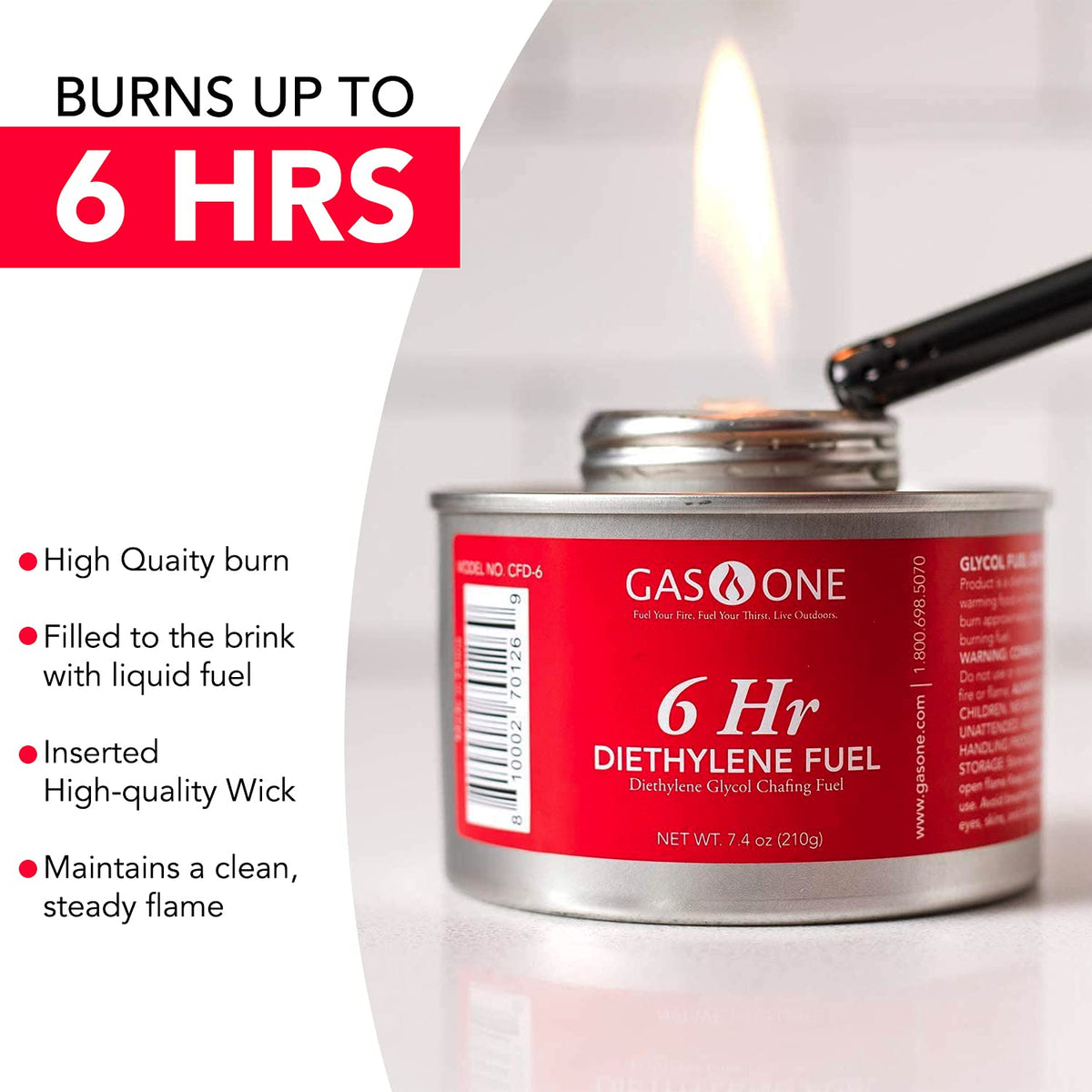 - Q: How long does Gas One Chafing Fuel last? A: Gas One Chafing Fuel burns for up to 6 hours, providing a long-lasting flame to keep your food warm.