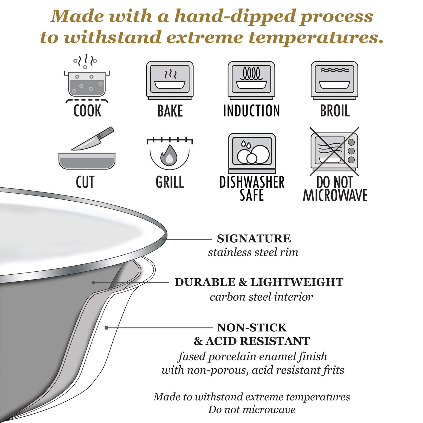 • Q: What materials are used in the Golden Rabbit Catering Bowl? A: The bowl features an elegant porcelain enamel finish on carbon steel with stainless steel rims for added durability.