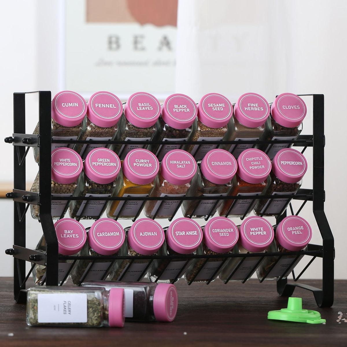 JARXSUN 24 Spice Jars with Labels-4oz Glass Spice Jars with Shaker Lids 3 Sets of Spice Labels 1 Collapsible Funnel 2 Erasable Markers (24 Deeppink)