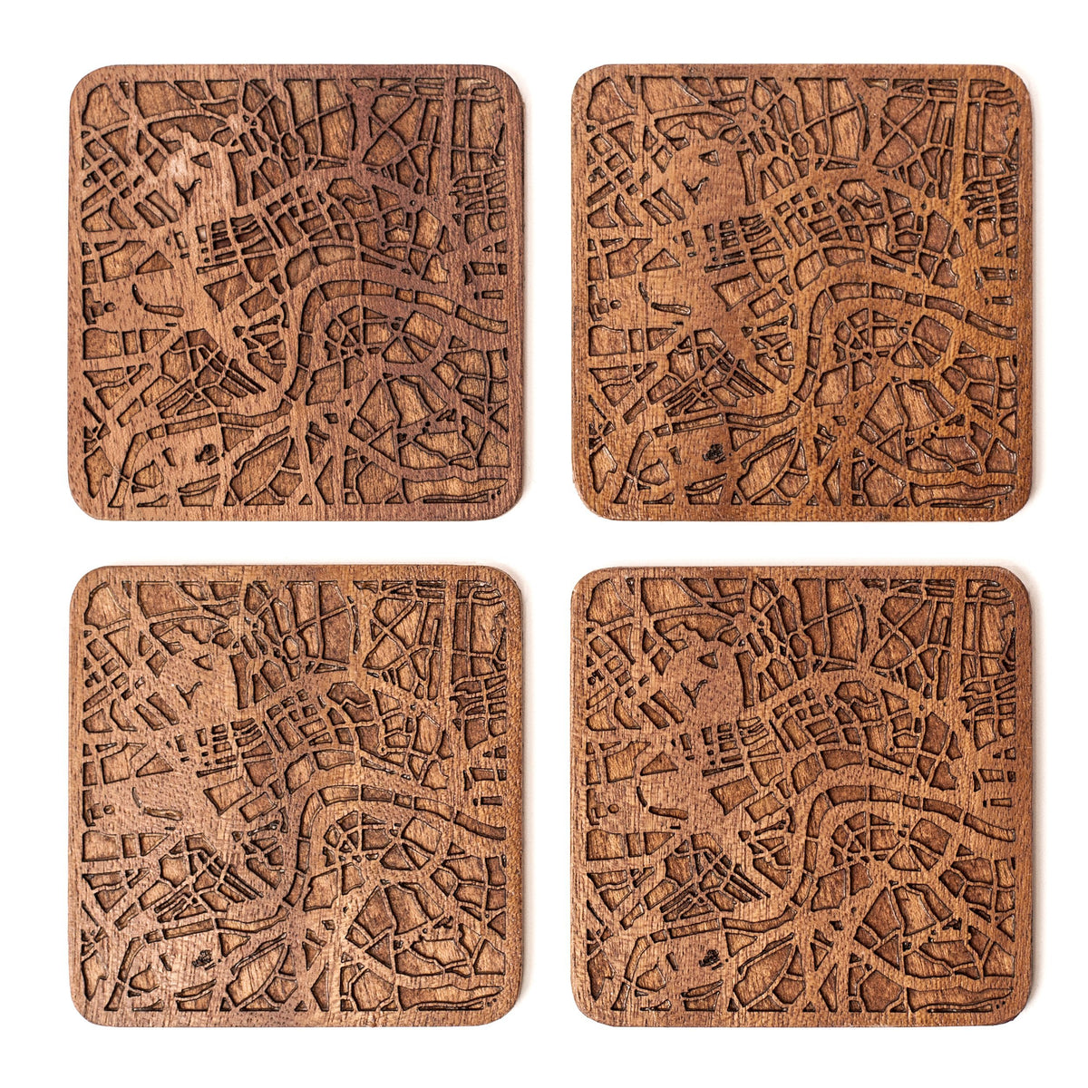 London Map Coaster By O3 Design Studio, Set Of 4, Sapele Wooden Coaster With City Map, Handmade
